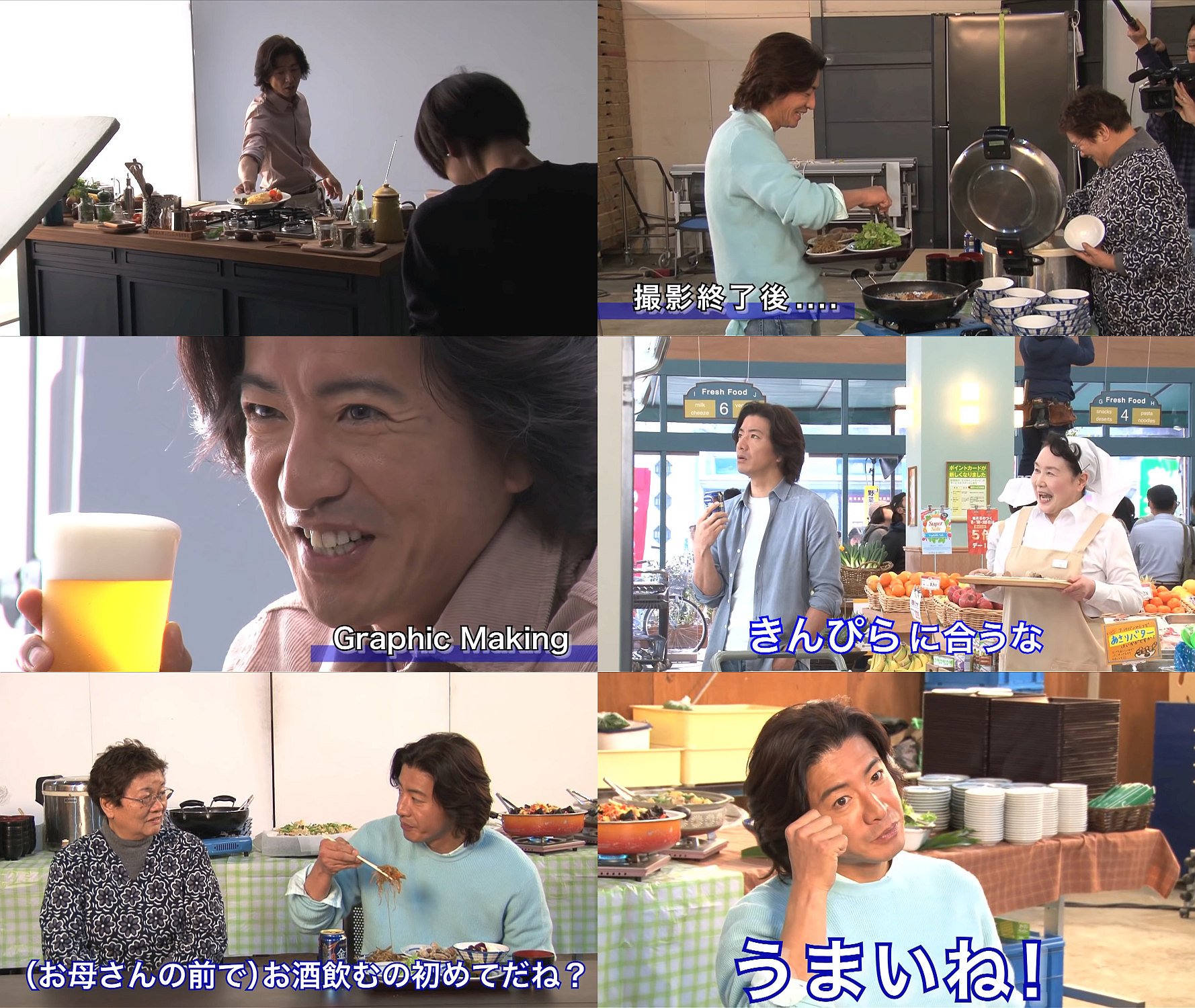 メイキングでは、「これ、きんぴらにあうな」と言うシーンの撮影の模様や、木村拓哉さんが料理をしてオムレツを作る様子や、撮影終了後に「お母さん」と呼ぶケータリング業者のオバサンの横で雑談をしながら、金麦を飲み食事をする模様なども見れます。