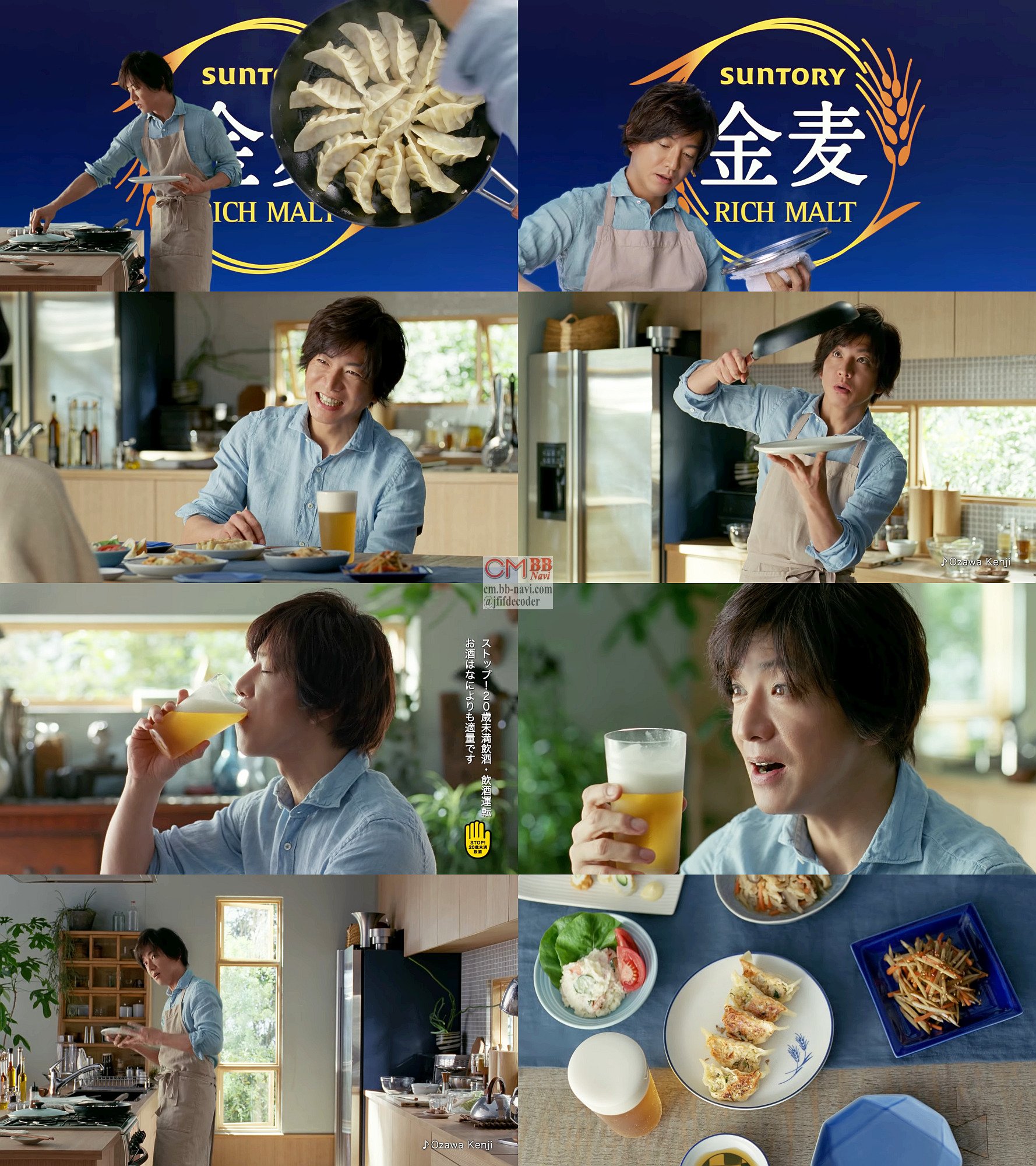 デニムのカジュアルなシャツにエプロン姿の俳優の木村拓哉さんが、「新しい金麦と羽根つき餃子。我が家の好物」と、キッチンで餃子を作って、皿に乗せようとして、「あれ?」と、餃子がフライパンにくっついてうまく取れず、羽根無し餃子になってしまい「羽根無し」と笑いながら夫婦で食事をし、「それは驚くほど食事にあう」と金麦を飲みます。