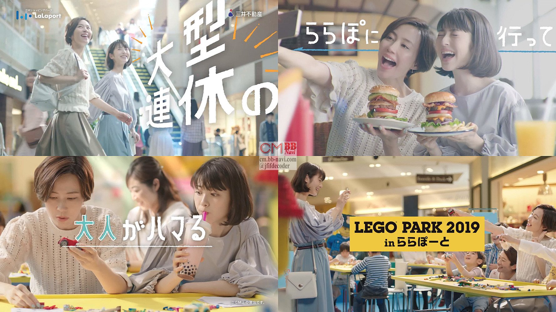 浜辺美波さんと木村佳乃さんがGWにららぽーとへ行って「子供のイベントに大人がハマる♪」と子供のLEGOイベントに夢中になる、三井ショッピングパーク ららぽーとのCM。