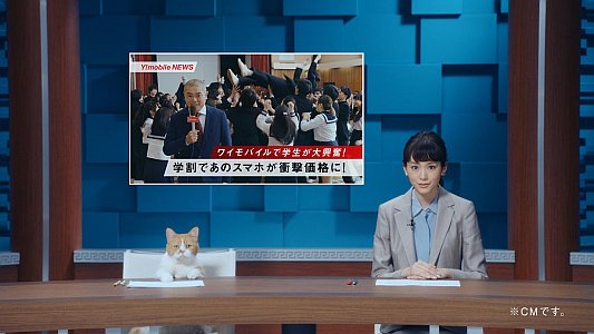 ニュースキャスターになった女優の桐谷美玲さんと中継のあばれる君が、スマホが学割で1980円/月になった事を伝える、ワイモバイルの限定公開中のCMです。
