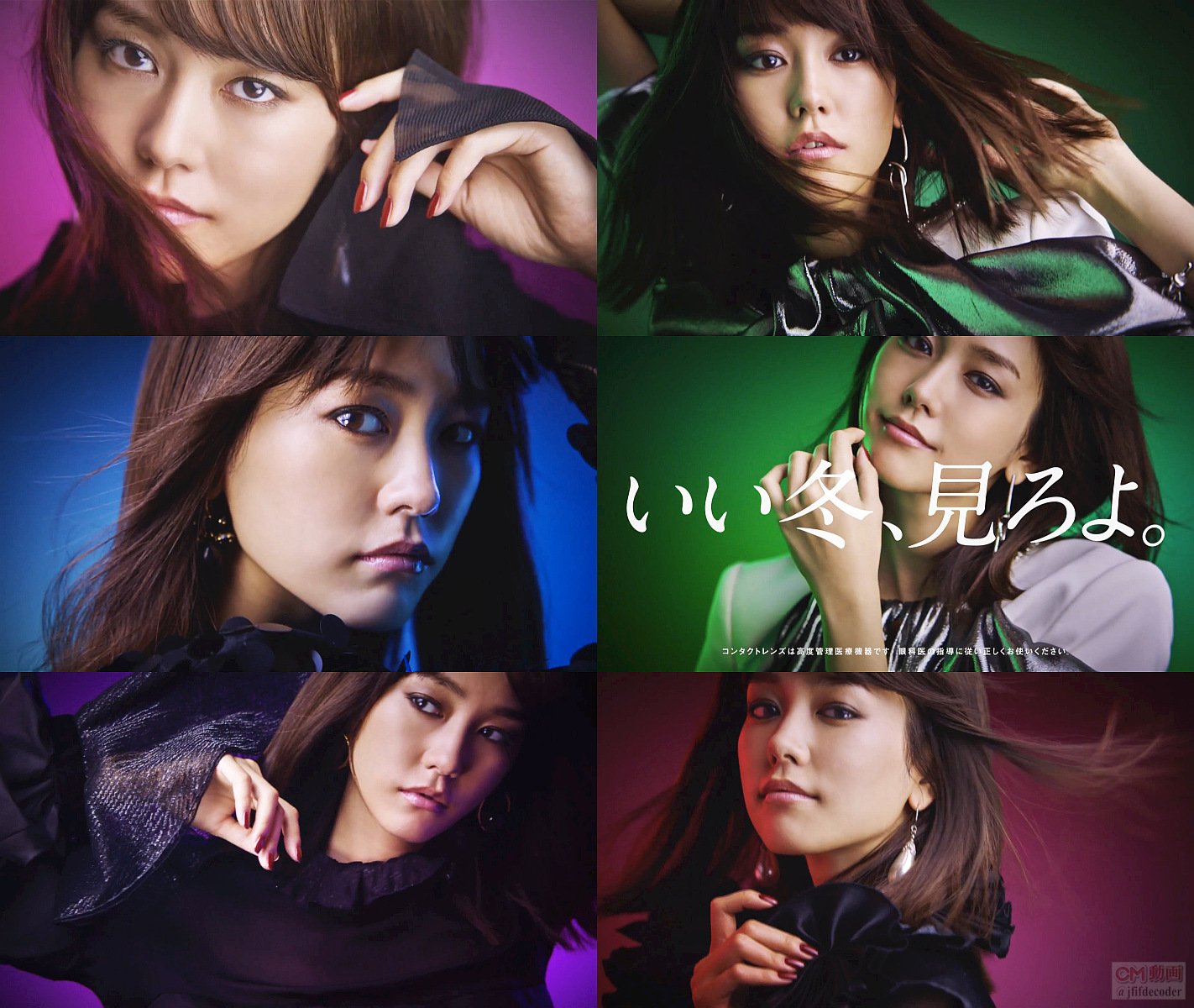 女優の桐谷美玲さんがポージングするスチル撮影映像と共に、「コンタクト買うならアイシティ。だって、キャンペーンやってますから」と言って、カメラマンに「近すぎ」と言い、最後に「いい冬見ろよ」と言う、コンタクトのアイシティのCM動画です。