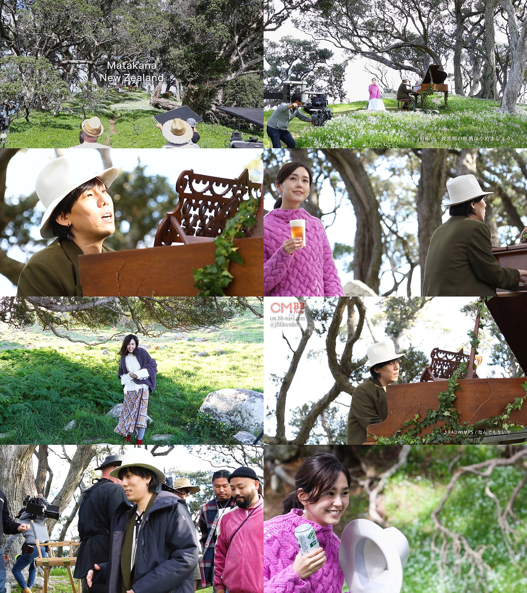 CM撮影は、ニュージーランドのオークランド北にあるマタカナで行われ、現地撮影スタッフと共に撮影が進んでいく模様が見れます。ほぼ全編に渡って野田洋次郎さんが歌う、アコーステッィクバージョンの”なんでもないや”が流れるPV風の仕上がりになっています。