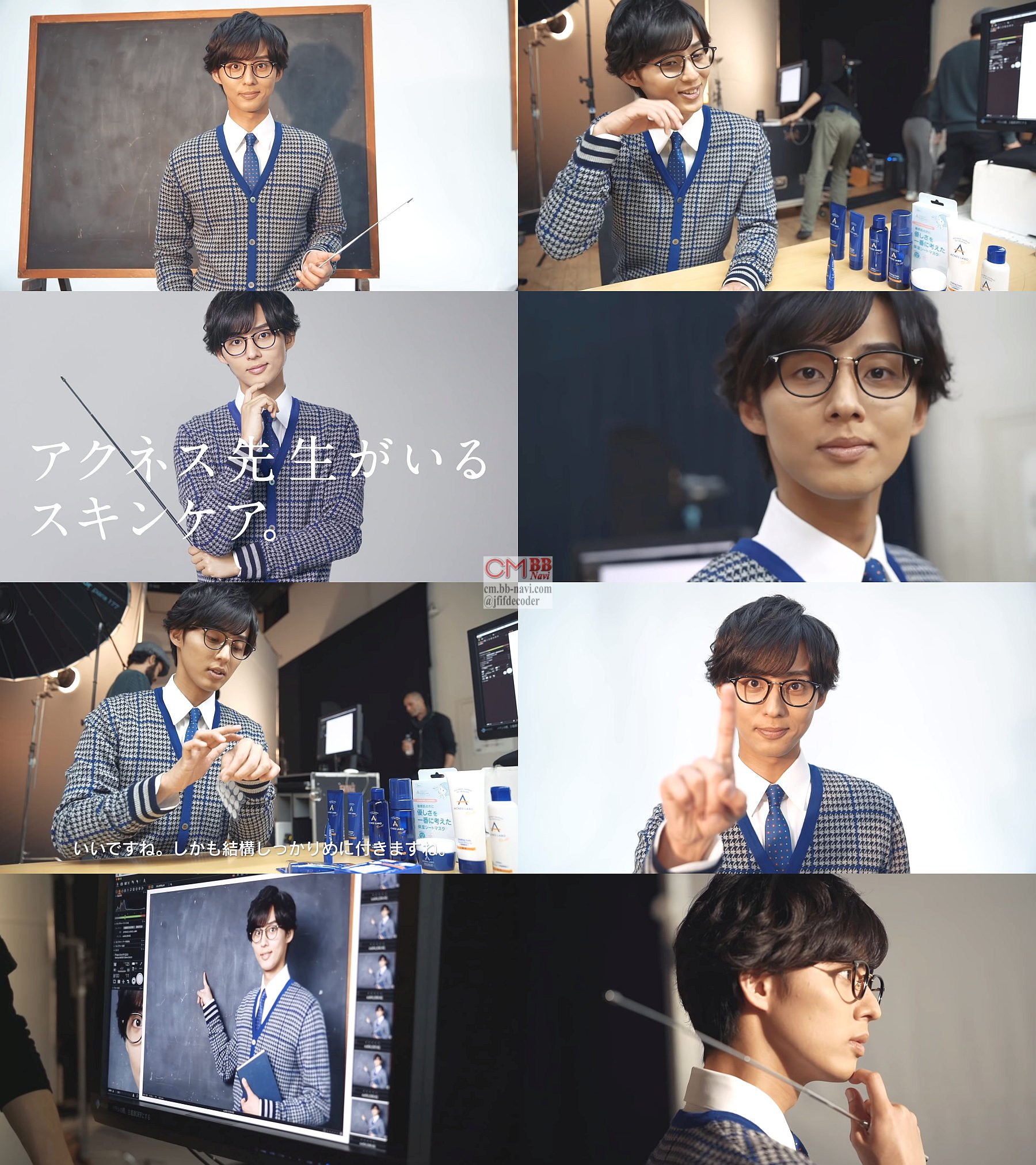 キスマイの藤ヶ谷太輔さんが、スキンケアを講義する、女性に優しいアクネス先生になるという設定で、打ち合わせ風景や、ポージングするキービジュアルのスチル撮影のメイキング映像や、藤ヶ谷太輔さんがアクネスラボを使ってる事を紹介し使うシーンの映像などを使った、ネイチャーラボ アクネスラボの長編Web CMです。