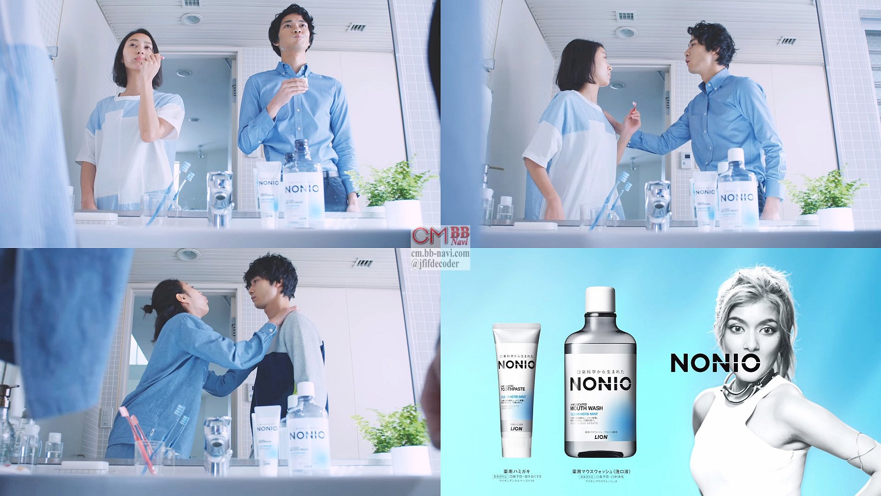 洗面所で彼女役の女優の岡本あずささんが歯を磨いてる横で、彼氏役の俳優の清原翔さんがノニオで口を濯いで「じゃぁ行ってくるね。フッ」と息を吹きかけ、岡本あずささんが「(笑)何それ?」と笑う、ライオン ノニオの短い6秒のCM。