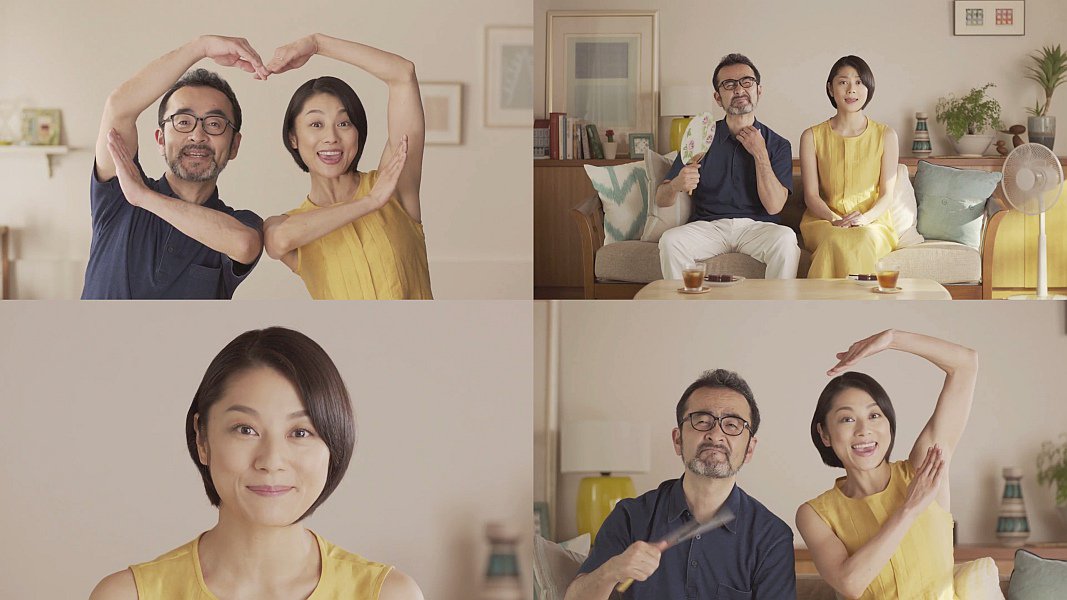 袖の無いからし色のワンピース姿の女優の小池栄子さんが、電気料金が安くなる、ENEOSでんきを紹介して「みんなハッピー」と脇を隠しながらポーズをして、夫役の古館寛治さんも一緒に脇を隠しながらポーズしてハートマークを作る、仲の良い夫婦になっている、ENEOSでんきのCMです。