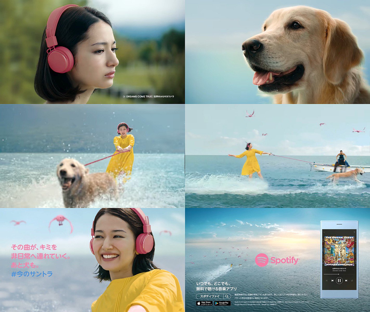 ちょっと落ち込んだ感じの女優の黒澤はるかさんがスマホで音楽を聴くと、犬が走り出して、水上を走り出して、モーターボートに引っ張られているようになって水上スキーをしてしまって皆が注目し、フラミンゴと共に大海原へと行く、スポティファイのCM動画です。