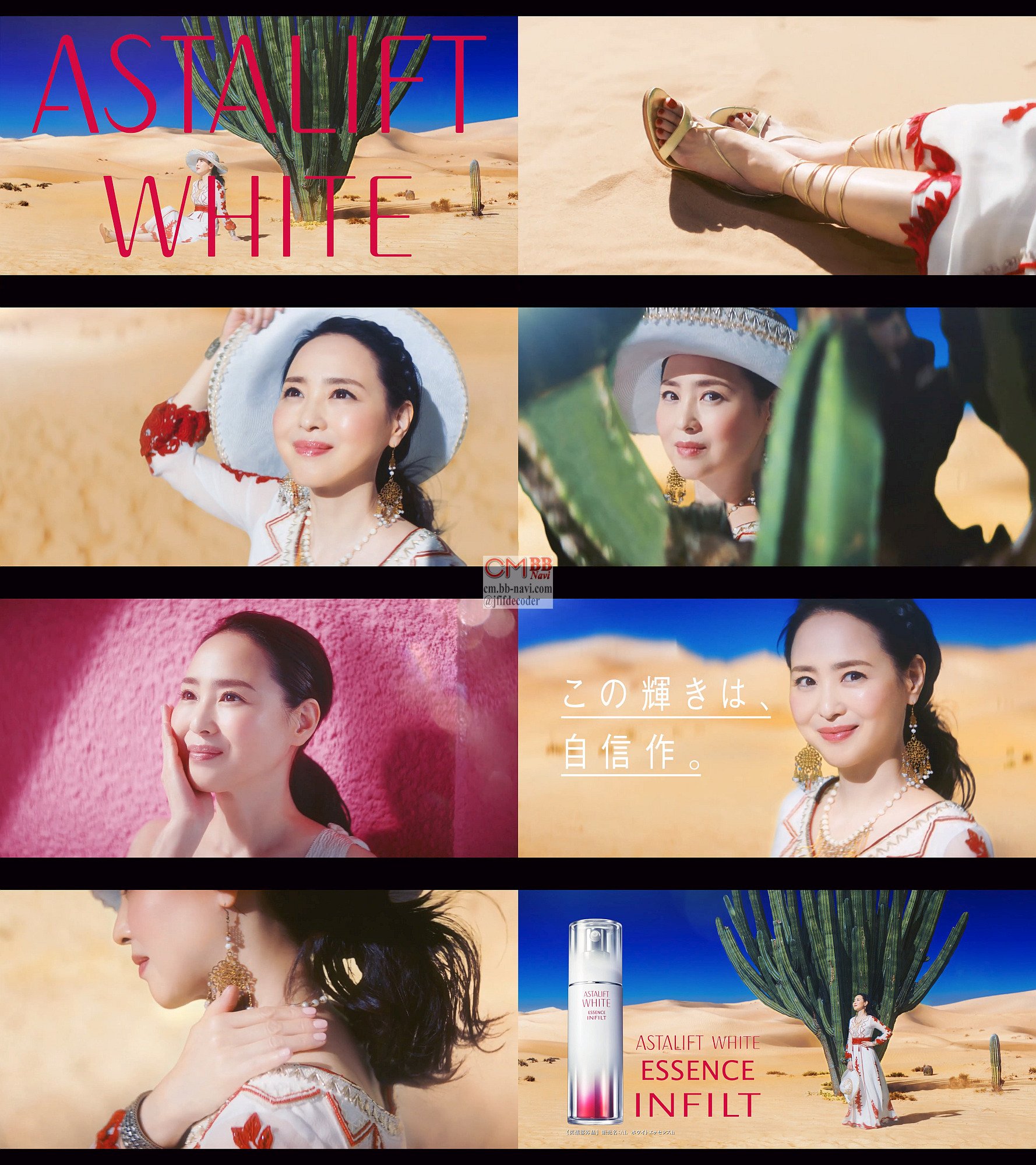 松田聖子さんが砂漠でソンブレのような帽子を取って「この輝きは自信作」と微笑む、富士フィルム アスタリフト ホワイト エッセンス インフィルトのCM 30秒版。