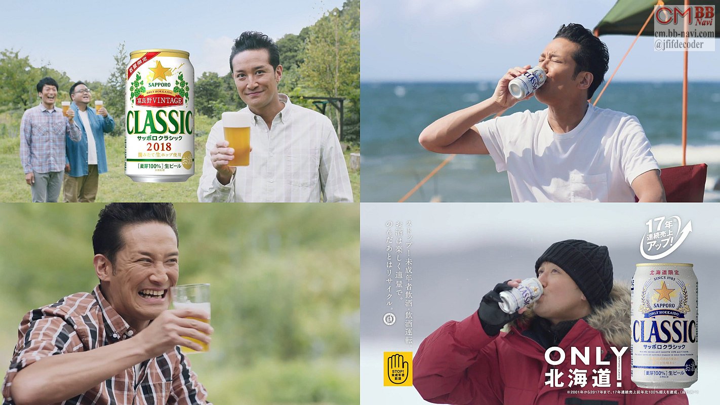 TOKIOの松岡昌宏さんが、「ここだけの四季を、ここだけの楽しさを、ここだけのおいしさを」と、北海道の自然の四季と旬の料理とサッポロクラシックを楽しむ映像を使い、「オンリー北海道、サッポロクラシック、富良野VINTAGE」と富良野VINTAGEを紹介して飲むCMです。
