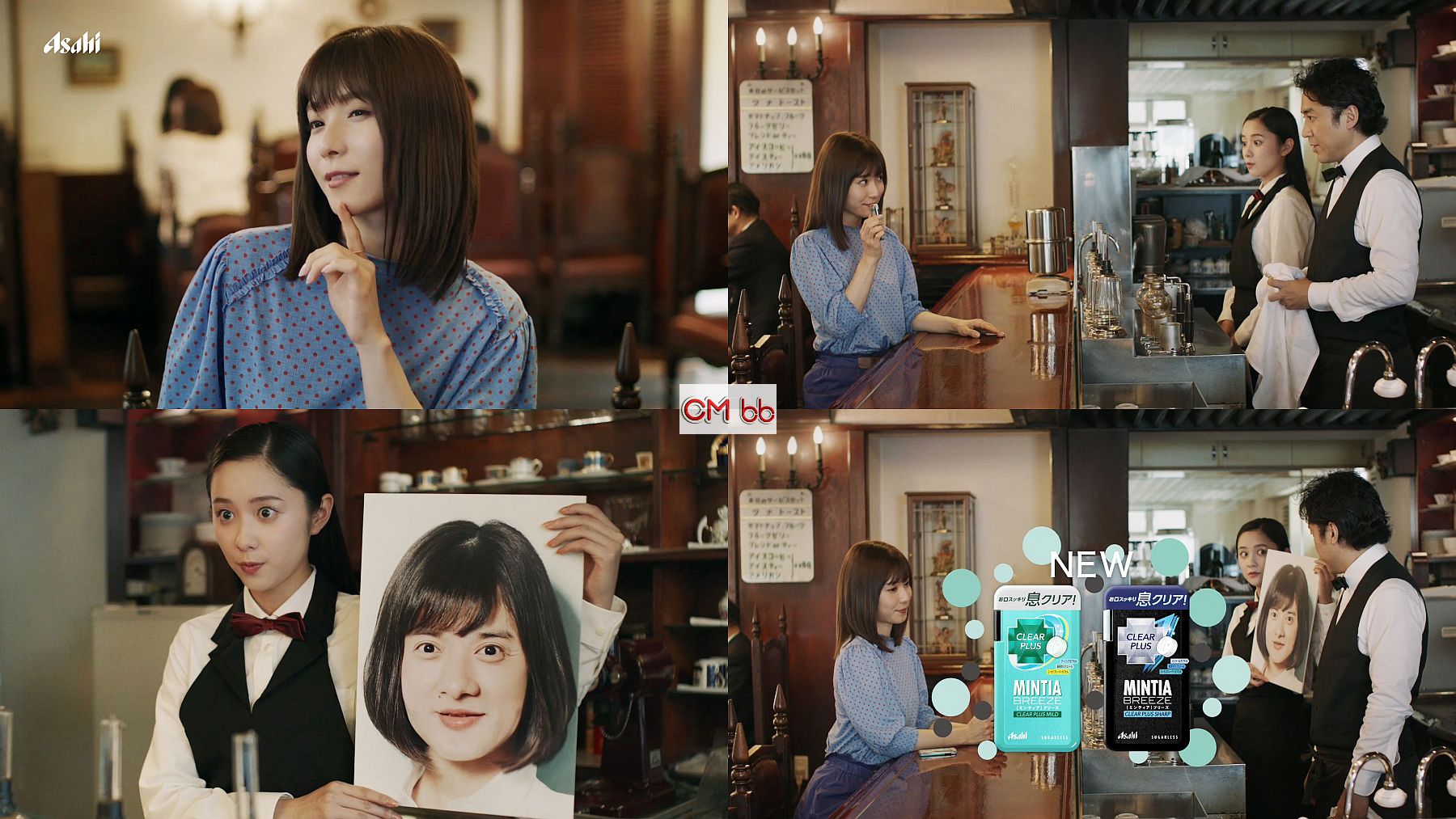 カフェのカウンターでため息をつく女優の松岡茉優さんに、マスター役の俳優のムロツヨシさんが声をかけ「トリプル配合のミンティアが出たの」「つまり、3つの何かが配合された?」と言うと、アルバイト役の女優の堀田真由さんが「因みに私達3人を配合すると」と、3人の顔を無理やり合体させた画像を手に言うと、ムロツヨシさんが即座に「タイプだ」と言い、続けて「付き合いたい」と言うと、間髪入れずに松岡茉優さんが「どうぞ」と言います。