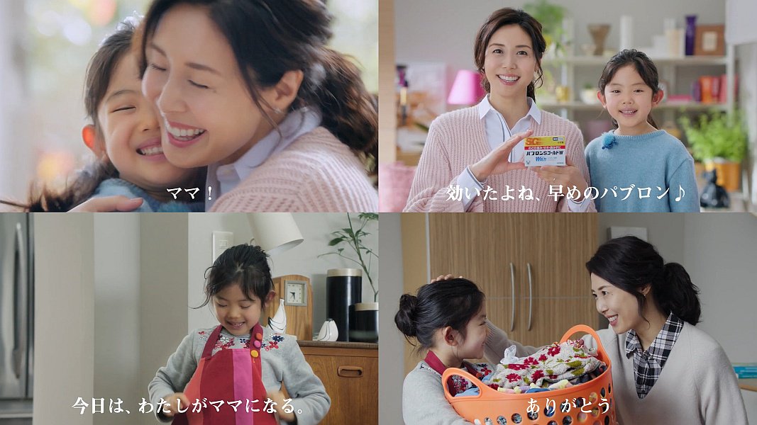 ママ役の女優の松嶋菜々子さんがのどの調子が悪く、娘役の阿由葉さら紗(あゆばさらさ)ちゃんが「ママが風邪をひいた。今日は私がママになる」と掃除機をかけようとしてコンセントが抜けて、大きな洗濯かごを一生懸命に抱えて洗濯物を落としているのを見て、松嶋菜々子さんが「ありがとう」と微笑み、翌日元気になって抱きしめる、大正製薬 パブロンSゴールドWのCMです。