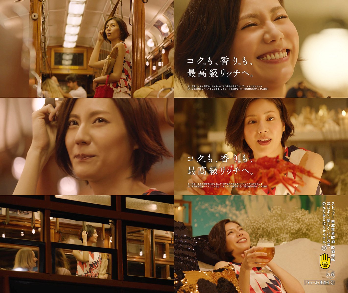 袖の無いシャツを着た女優の松下奈緒さんが、フランスパンを抱えて電車に揺られて家路へ着き、ディナーは伊勢海老を肴にして、プライムリッチを飲むCM 30秒版です。