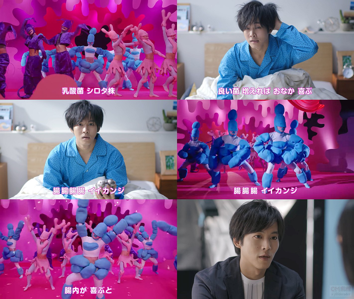 俳優の松坂桃李さんのお腹の中で、登美丘高校ダンス部OGたちが腸内細菌になって、 モーニング娘の恋愛レボリューション21の替え歌で「腸腸腸イイカンジ♪ 腸腸腸腸イイカンジ♪」とです。ノリノリで歌ってキレキレで踊って、腸内環境が改善される長編CMです。