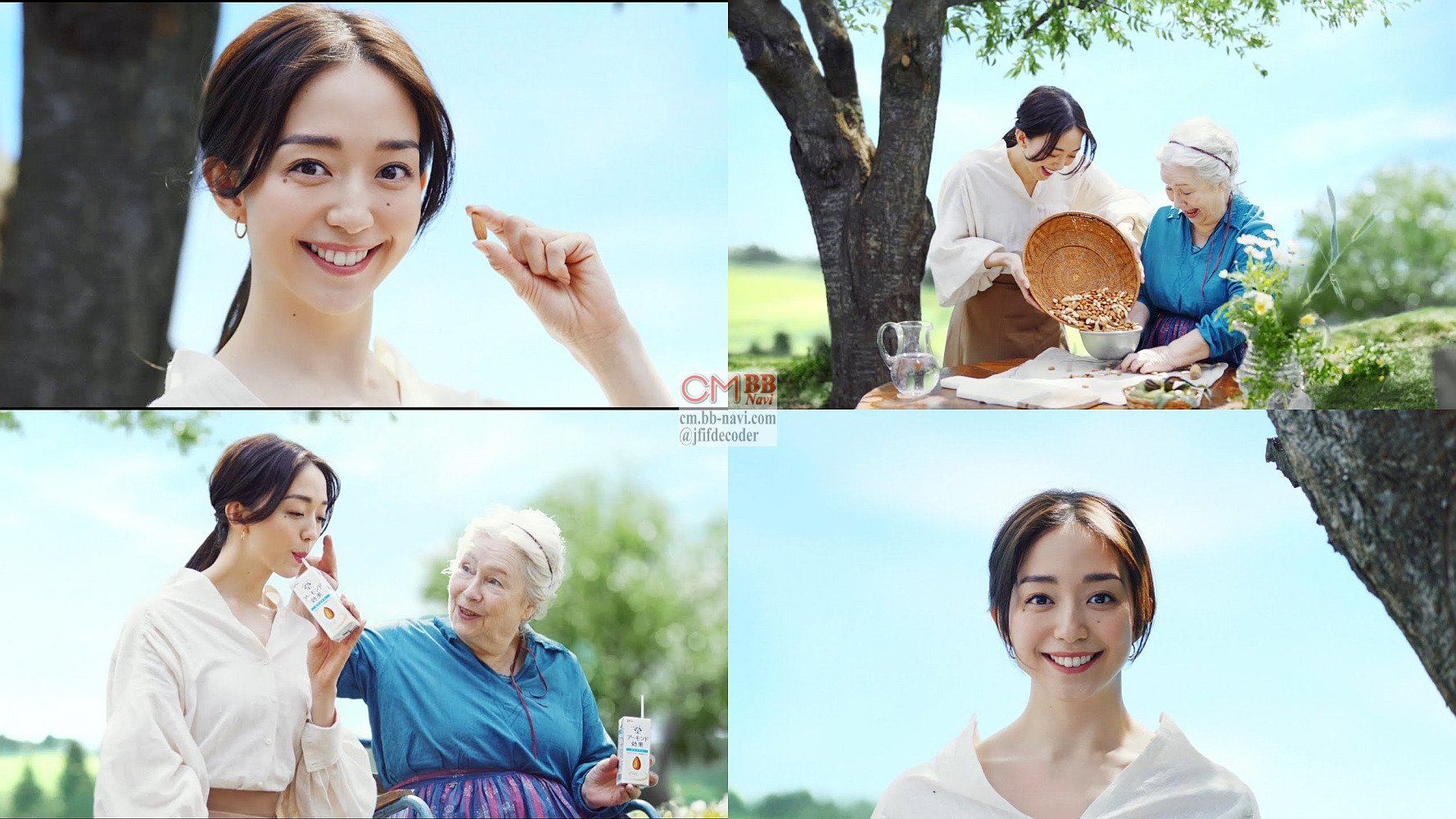 モデルで女優の松島花さんが「驚かないで下さい」「この木からおいしいアーモンドミルクがとれるんです」と登場し、老婦人と一緒に落ちてくるアーモンドをザルに集めてすりつぶすと、グリコ アーモンド効果になって、おいしそうに「香ばしい」と飲むCM 30秒版です。