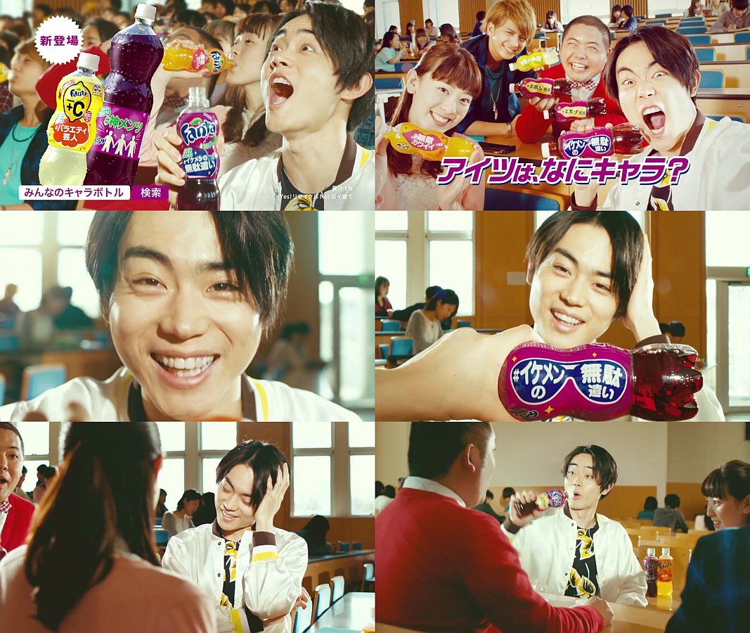 学生役の菅田将暉さんがファンタのみんなのキャラボトルを持って「このファンタ、ヤバイぞ」と、俳優の中島健さん達友人達の所へやってきて「達也(たつや)はギャル男」「瞬(しゅん)はボケ担当」「香ちゃんは無敵かわいい」と言い、香ちゃん役の水上京香さんからは「菅田君はイケメンの無駄遣い」と言われ、「無駄遣いてあ〜た」と返す、ファンタのCMです。