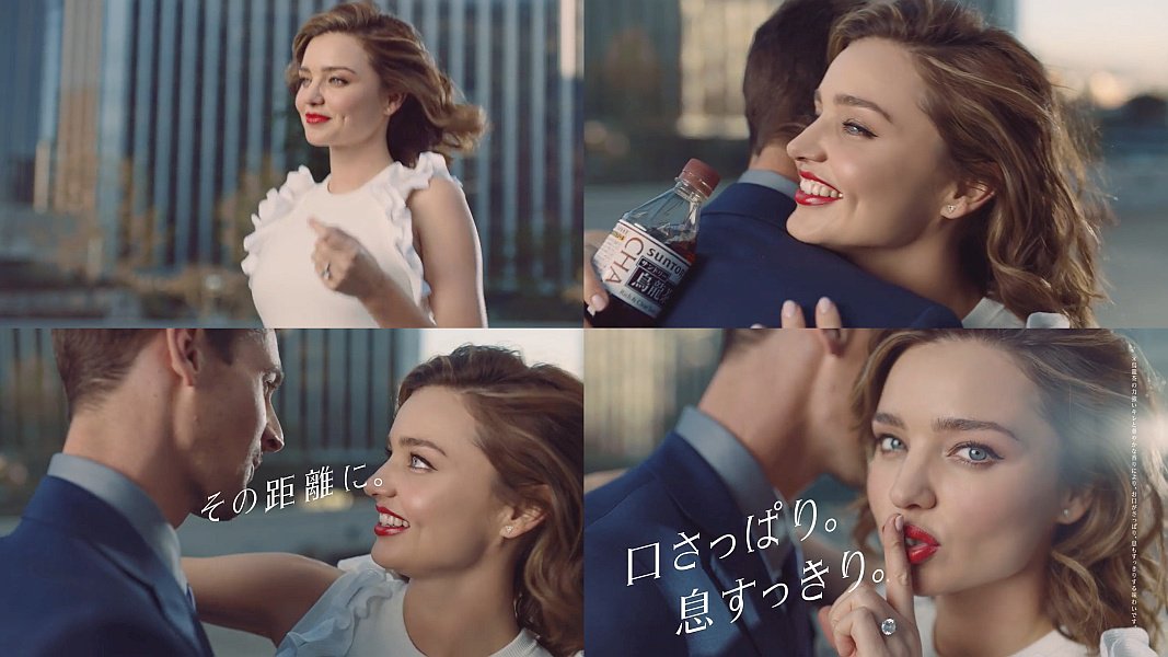 袖の無い白のシャツを着たスーパーモデルのミランダ・カーさんが、ウーロン茶を飲んで、男性に抱き着き、「息、スッキリ」と言う、サントリー 烏龍茶のCM動画です。