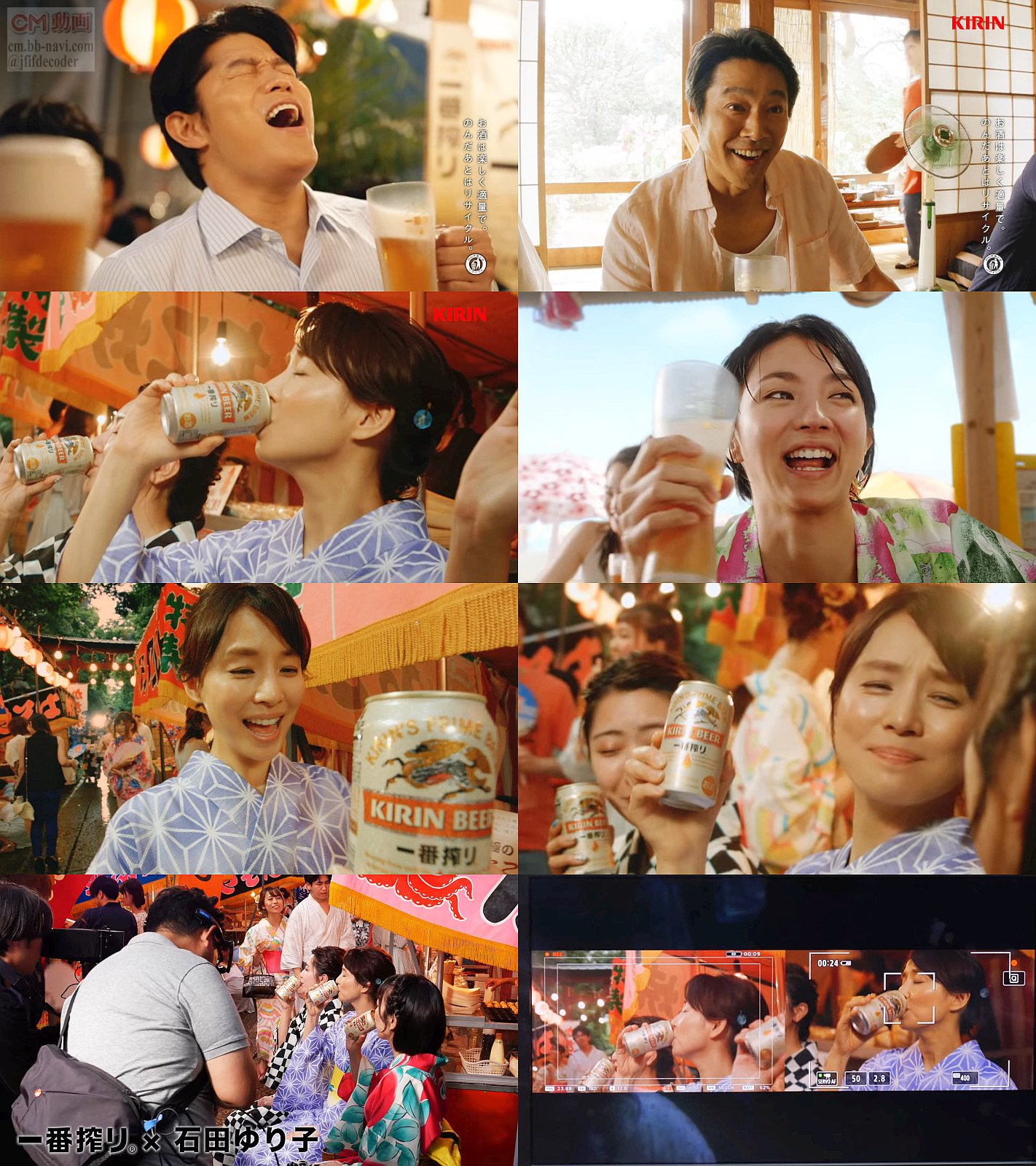 女優の満島ひかりさん,石田ゆり子さん、俳優の堤真一さん,鈴木亮平さん達が、それぞれの夏の場面でキリン一番搾りを飲む、短い6秒のキリン一番搾りのCMです。