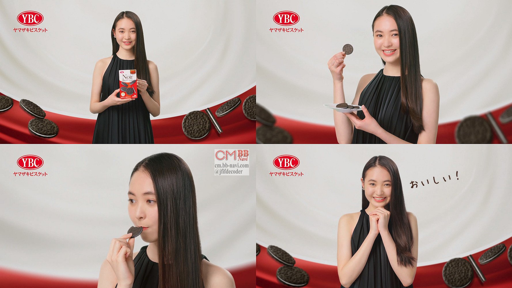 袖の無い黒のワンピース姿のロングヘアーの女優の宮野陽名さんが、ノアールのパッケージを手にし「ノアールには色々あります」「今日の気分はこれ、ノアール 薄焼きサンド」とノアールを一口食べて「味わうたびに好きになる。ノアールシリーズ」と言うCMです。