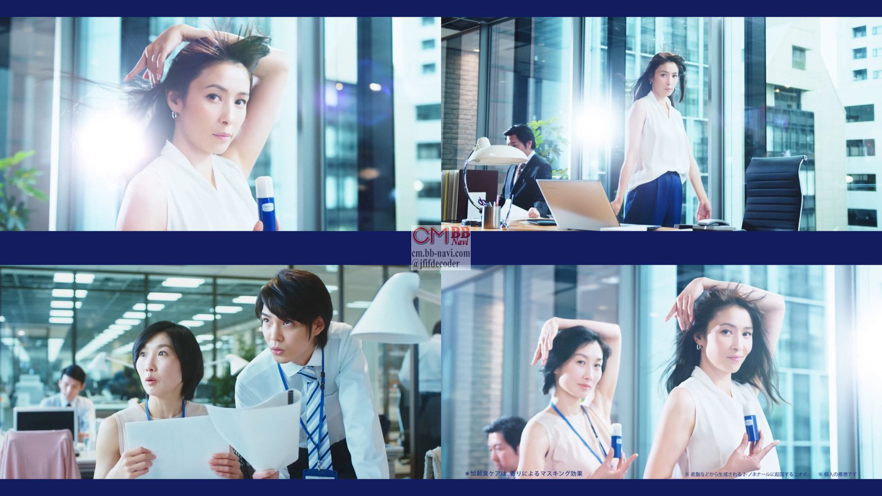 ノースリーブのシャツを着たOLの女性が、「汗のニオイ変わってきたかも」「加齢臭?」とワキのニオイを気にしてる所へ、男性サラリーマンが先輩とやってきてドキッとしてると、デオ子役の水野美紀さんが登場し「デオ子さん?」と言ってる間に、オトナ女性の制汗剤デオコを紹介し、最後はOLと水野美紀さんが一緒になってワキを見せ、デオコを手にポーズします。