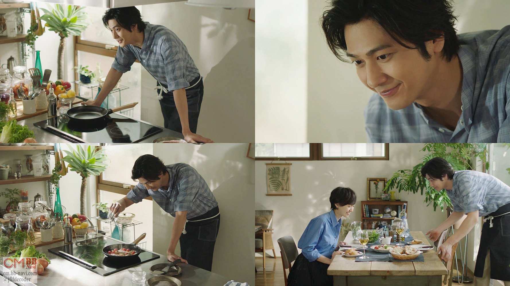 俳優の速水もこみちさんが突然キッチンに現れ、主婦役の女性が驚いている間に、料理を作って「はい、アクアパッツァ」とテーブルに出すと、パッと消えて夫に戻る、にんべんのCMのメイキング動画。