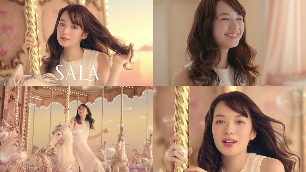 袖の無い白のワンピース姿の女優の森絵梨佳さんが、メリーゴーランドに乗りながら、カールした長い巻き髪を指で撫でて、スタイリングをして、乙女チックに微笑む、SALA(サラ) すっぴんふわ巻きミストの限定配信中のCMです。