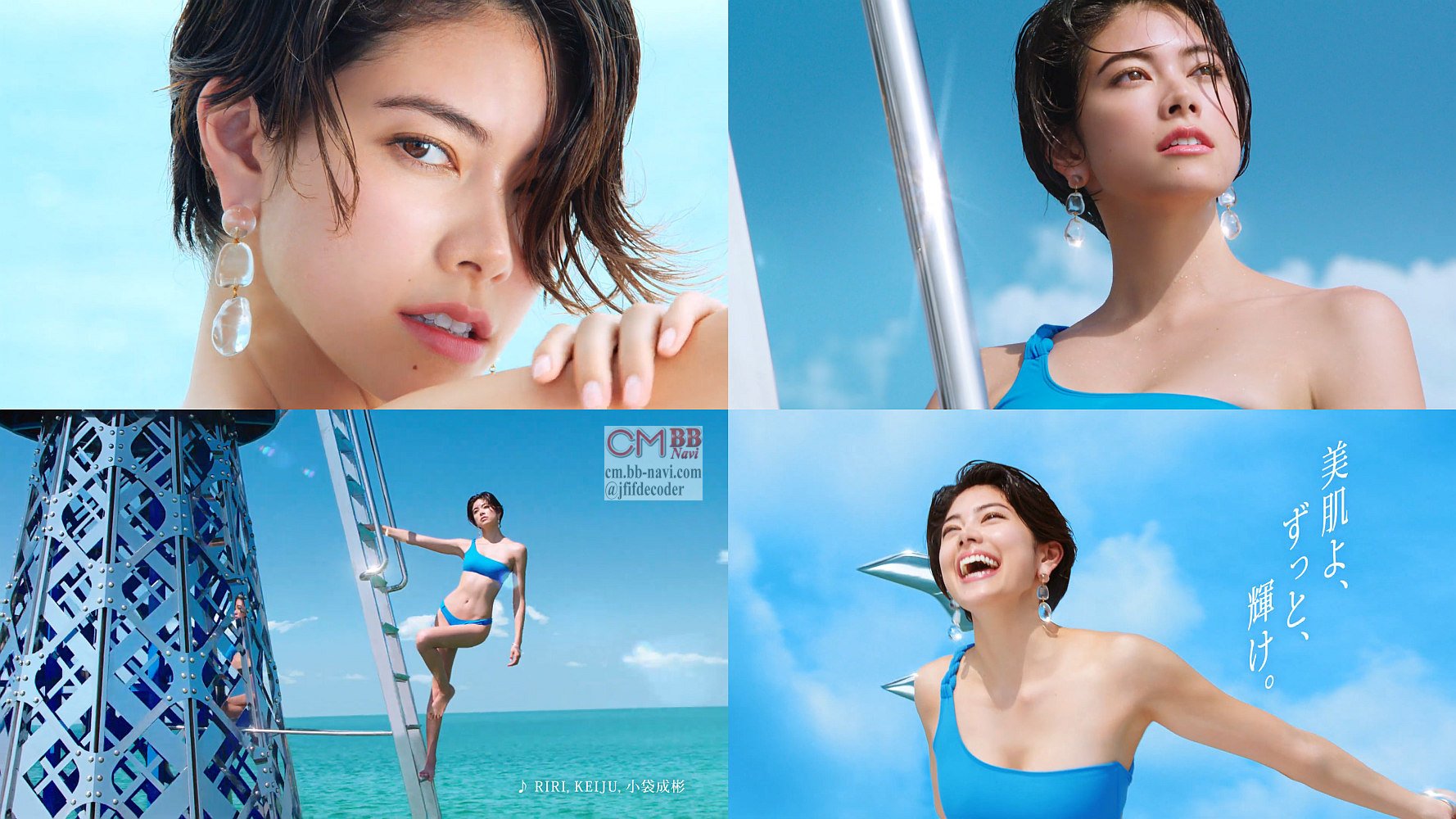 森星さんが、真っ青なビキニ水着で海のタワーのてっぺんから「ずーっと輝け」と叫ぶ、資生堂アネッサのCM 30秒版。