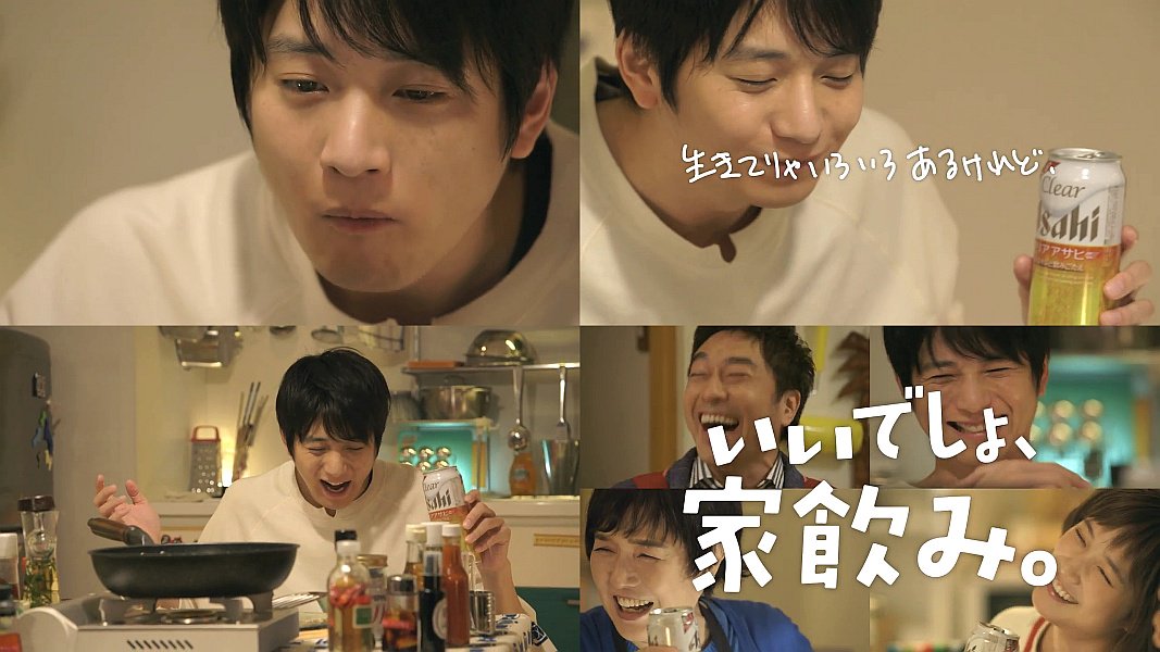 俳優の向井理さんや、女優の本田翼さん達が、それぞれの場面で自宅で餃子を食べて家飲みして幸せになる、クリアアサヒのCMです。