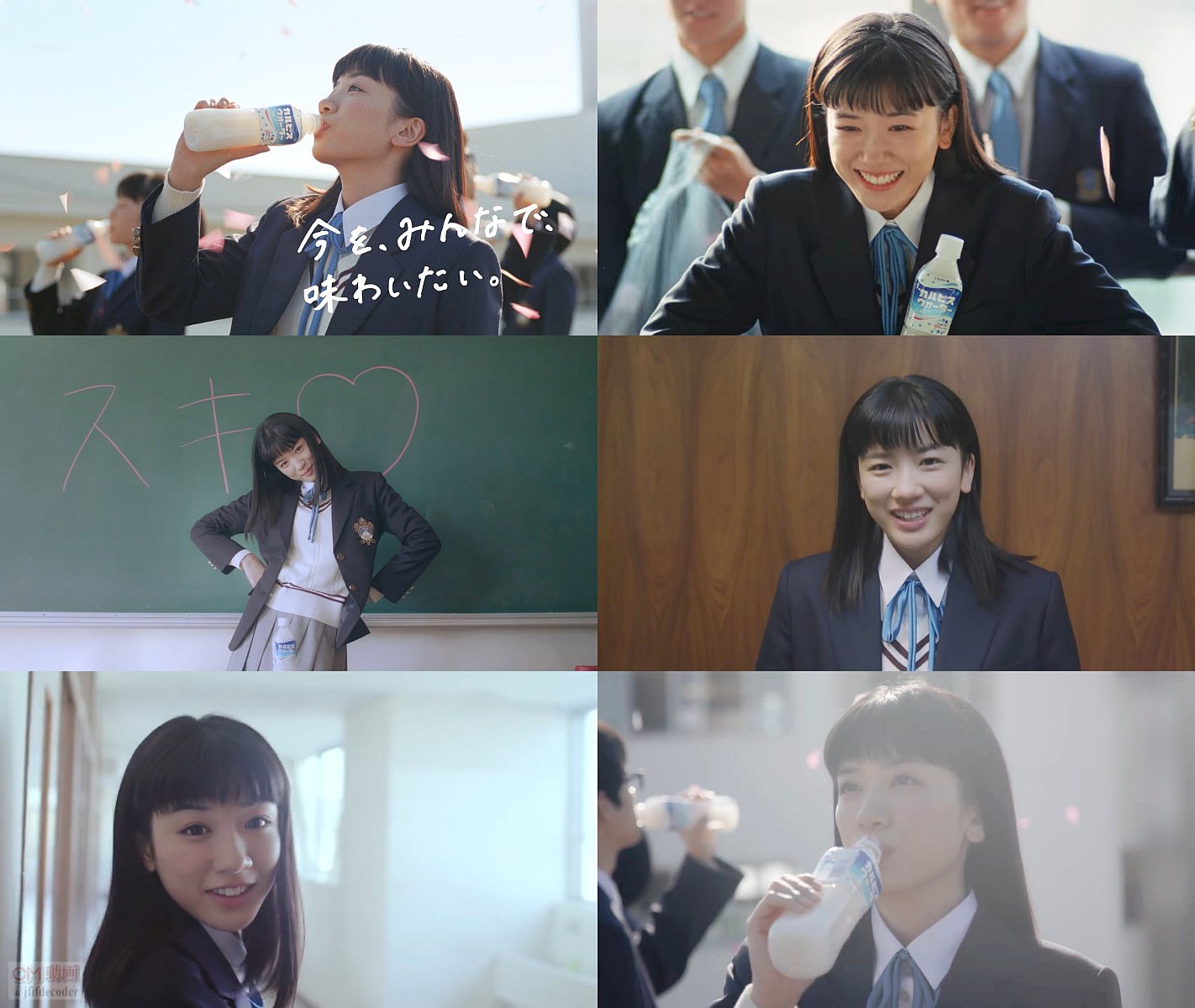 高校生役の永野芽郁さん達がメッセージを描いた紙いっぱいの袋を手に、卒業式の体育館へと走り、「おめでとー」と紙吹雪のように紙が舞い、「今を、みんなで味わいたい」と語る、 カルピスウォーターのCM 30秒版です。