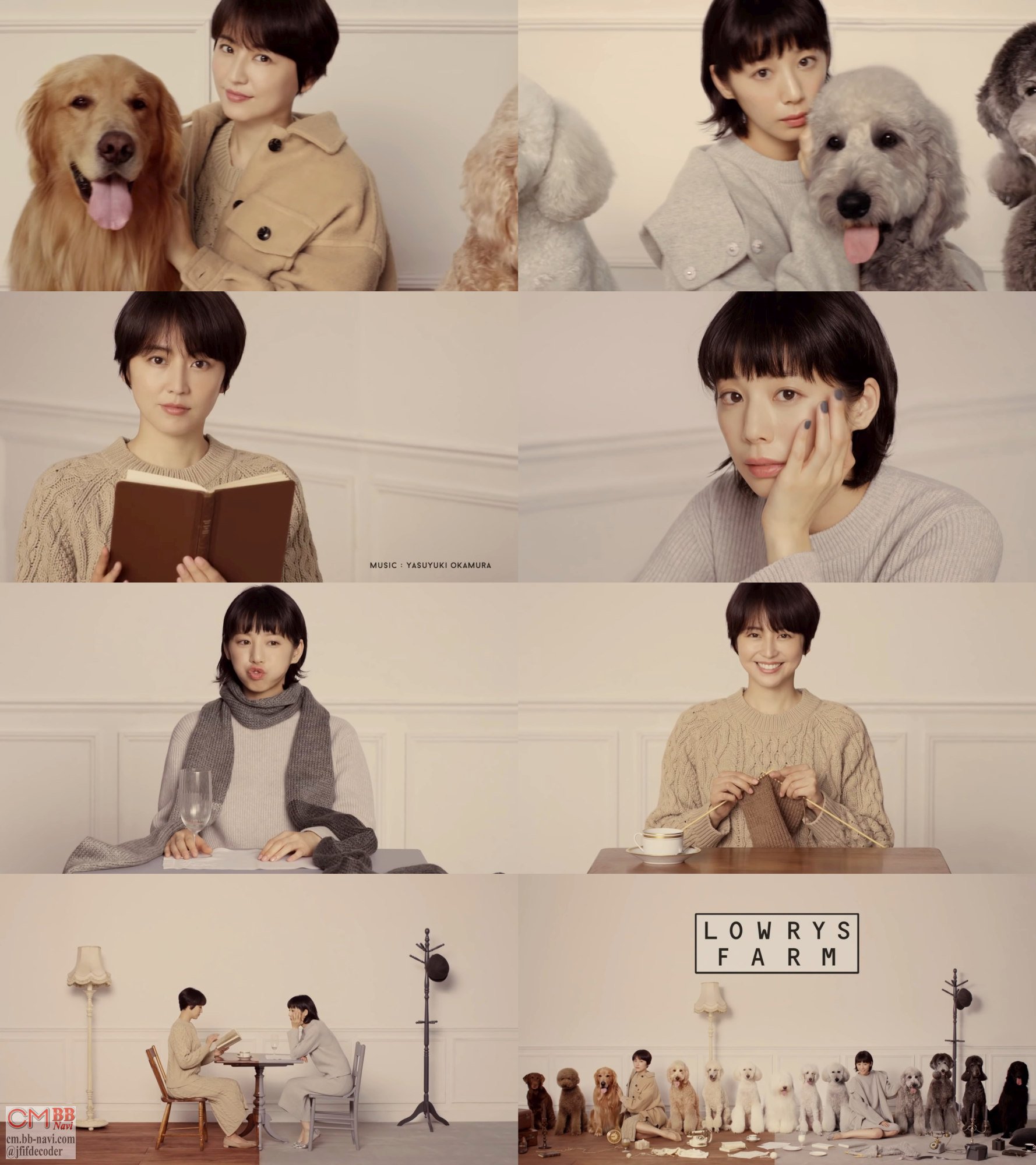ベージュ系の色合いのセーター&スカートの女優の長澤まさみさんと、グレー系のセーター&スカートの女優の夏帆さんがテーブルに向き合って座ったり、編み物をしたり、床に脚を崩して座ったり、最後は同じ色合いの犬達とグラデーションのように一緒に床に並ぶ、ファッショナブルなローリーズファームの限定配信中のCM 1分版です。