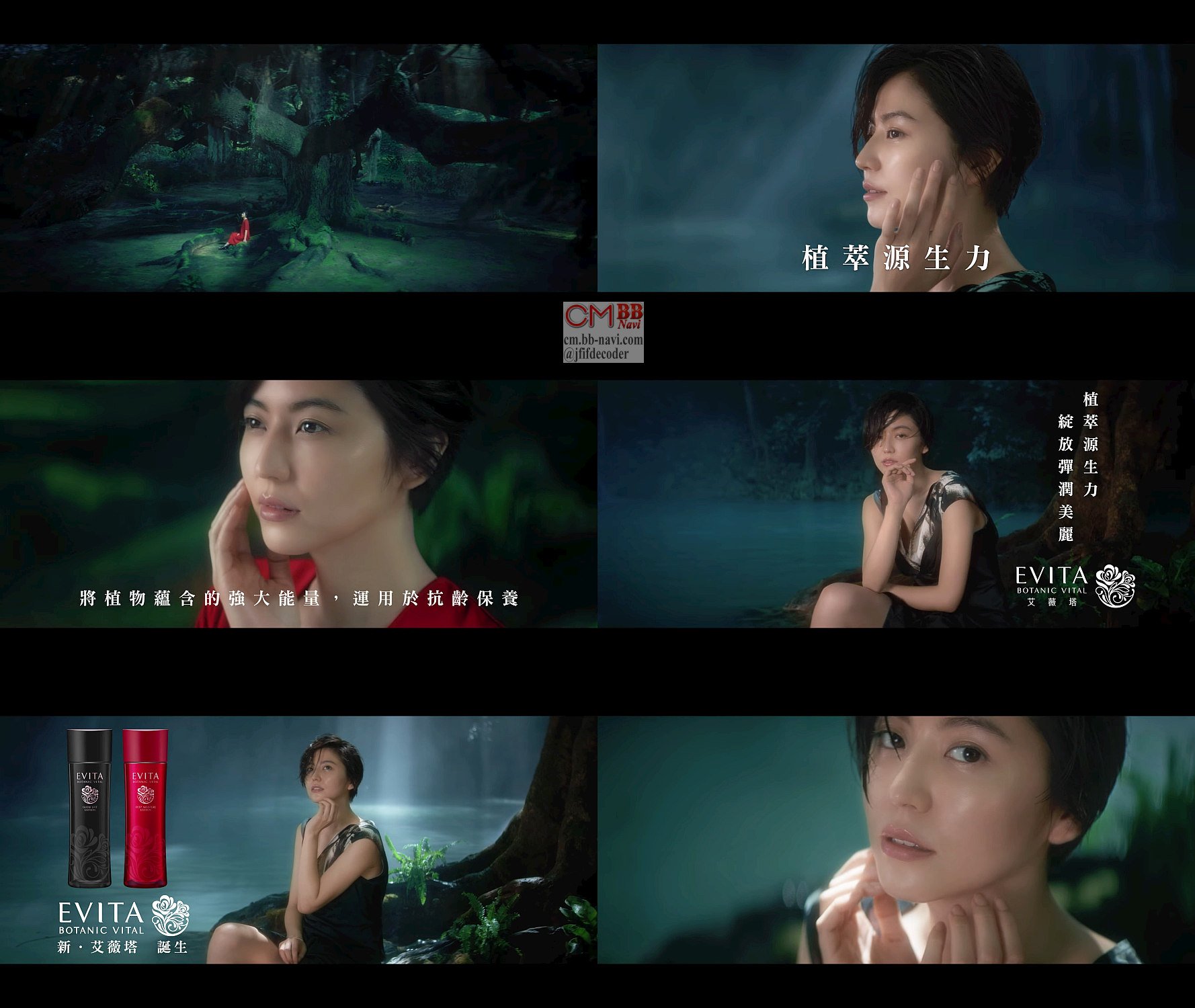 赤のワンピース姿の女優の長澤まさみさんが「植物は強い」と登場し、短めの黒のワンピース姿で水辺に育つ大木の大きな根に腰かけポージングをし、自然の植物の強さを感じ、「誕生。エビータ ボタニバイタル。植物の強さを、あなたの美しさに」と言う、カネボウ エビータ ボタニバイタルの中華圏向けの中国語字幕のグローバルCM 30秒版です。