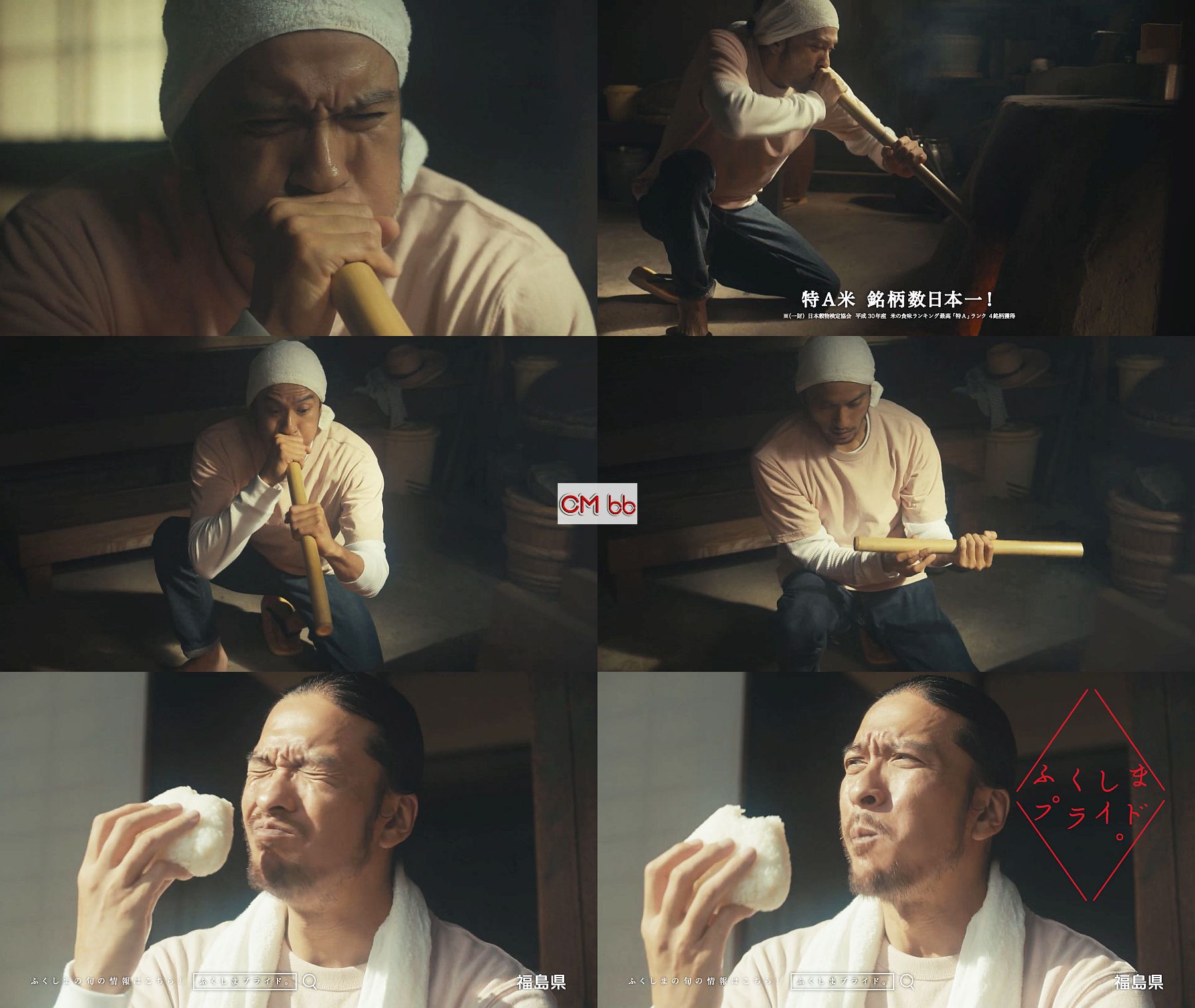 髭を生やしタオルを頭に巻いたTOKIOの長瀬智也さんが米を炊くかまどで、火吹き竹で火を強めながら「去年も一昨年も」 女性ナレーションが『日本一。福島』 再び長瀬智也さんが「今年こそ」と言うと、真剣に集中し過ぎて、火吹き竹が尺八のように鳴るほどになって、「うわっ」と驚き、女性ナレーションが『食べてみて、福島の新米』 長瀬智也さんが「うーん」とおにぎりを食べます。