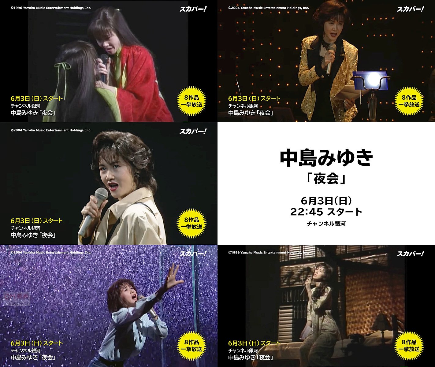 スカパーで中島みゆき 夜会8作品一挙放送告知のCM。中島みゆきが脚本・作詞・作曲・歌・主演の5役を務める、言葉の実験劇場”夜会”過去8作品をスカパーのチャンネル銀河で6月3日(日)夜10時45分から放送との事。
