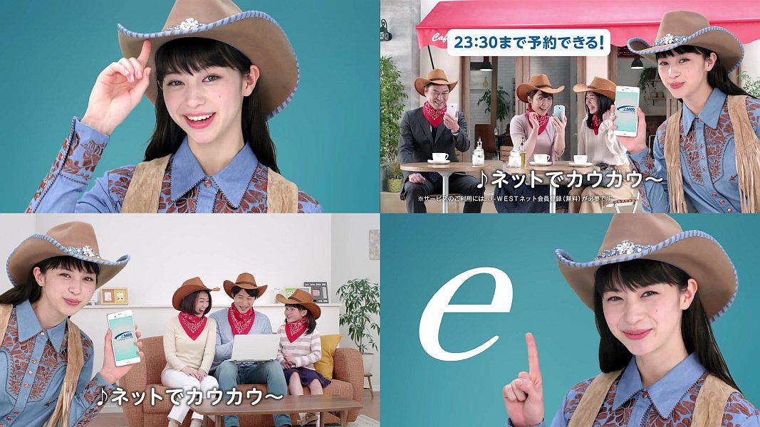 カウガール姿の女優の中条あやみさんが、スマホを片手に「駅に行かずにネットでカウカウ〜♪」「お得なキップをネットでカウカウ〜♪」と歌う、JR西日本e5489のCM動画です。