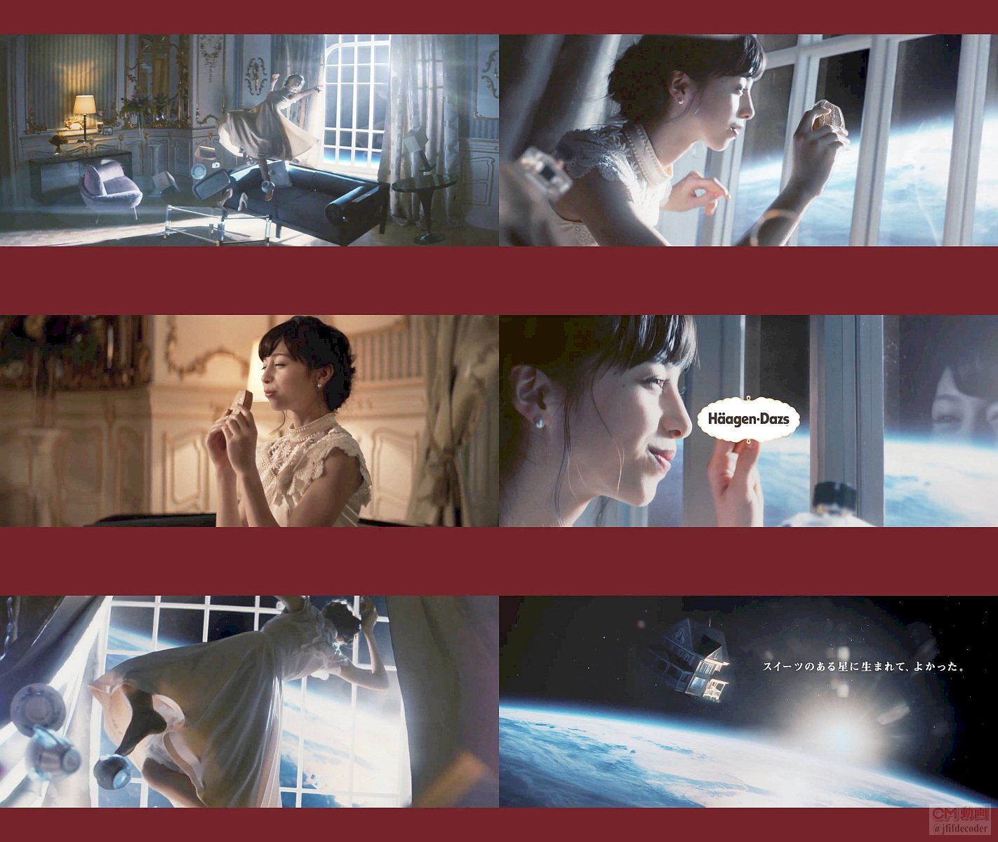 貴婦人のような衣装を着た女優の中条あやみさんが、ハーゲンダッツのクリスピーサンドを一口かじると、うっとりとした表情になり、部屋全体が軽くなって無重力状態になり「スイーツにある星に生まれて、良かった」と語り、窓の外を見るとそこには地球で、家全体が宇宙空間にまで舞い上がって浮いている、ハーゲンダッツにしてはこれまでに無い展開のCMです。