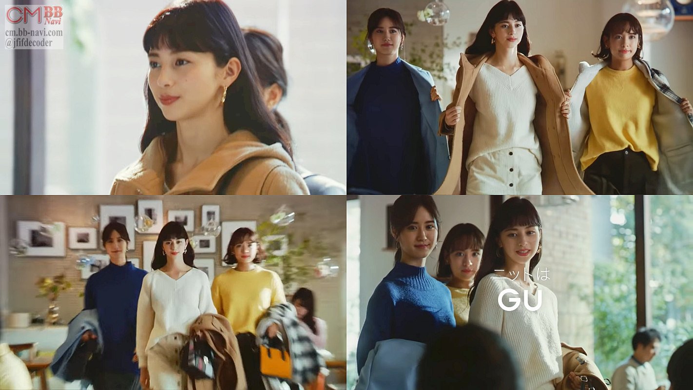 「中条あやみ、常にこの時期ニットらしいよ」「常にニットって」と会話してる女子の目の前に中条あやみさんがコートを着て登場し「ニット着てない…」と言うと、「ニット着てるんですけど〜」「中に着てるんですけど〜」と男性ナレーションと共に、コートを脱いで薄いニット1枚になって歩いてきて、「ニットはGU(ジーユー)」と言って、女子二人が声を揃えて「中に着てたかぁ〜」と言う、GUのCMです。