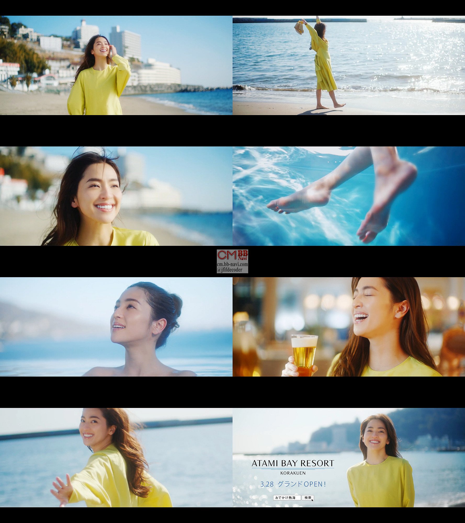 女優の中村アンさんが「おでかけ熱海」と、熱海の砂浜の波打ち際を素足で歩き、海が見える広い露天風呂でのんびりして、留守電に「中村アンは、ただいま熱海までお出かけ中です」のメッセージが流れる、熱海ベイリゾート後楽園誕生のCM 30秒版です。