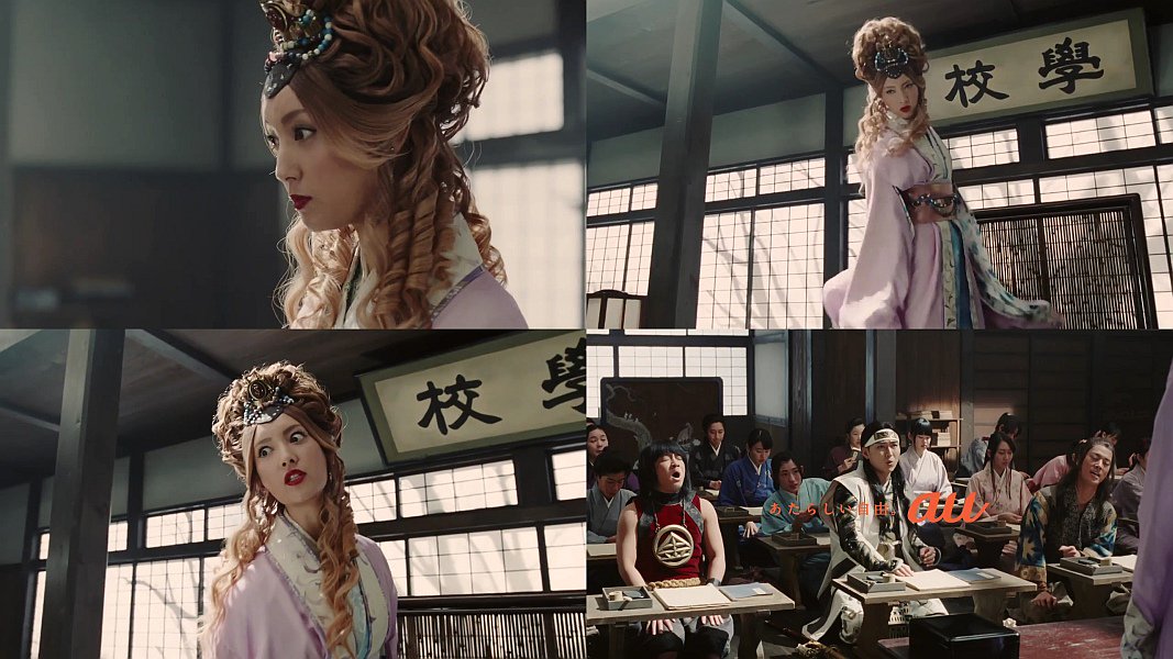 桃ちゃん役の松田翔太さん,浦ちゃん役の桐谷健太さん,金ちゃん役の濱田岳さんの3人が学校に行くと新任女教師が、乙ちゃん役の菜々緒さんで、「やってみたかったの、スパルタ教師」と鞭を持って登場し鞭打ちすれば、浦ちゃんが「ここ、天国〜」と言う、auのCMです。