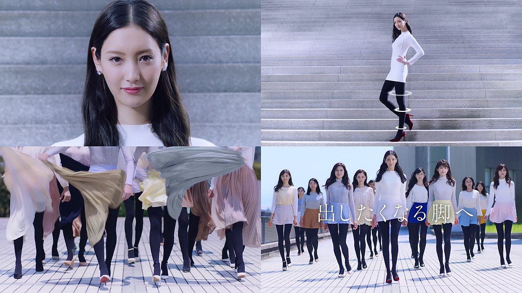 ロングヘアーの女優の菜々緒さんが、「冬の脚には自信が無かった」と登場し、「でも、もう隠さない」と言うと女性達が一斉にロングスカートを脱ぎ捨てミニスカートになり、菜々緒さんは階段でマイクロミニのボディコン姿でポージングをし「冬でも出したくなる脚へ」と一緒に歩き出す、限定配信中のメディキュットのCMです。