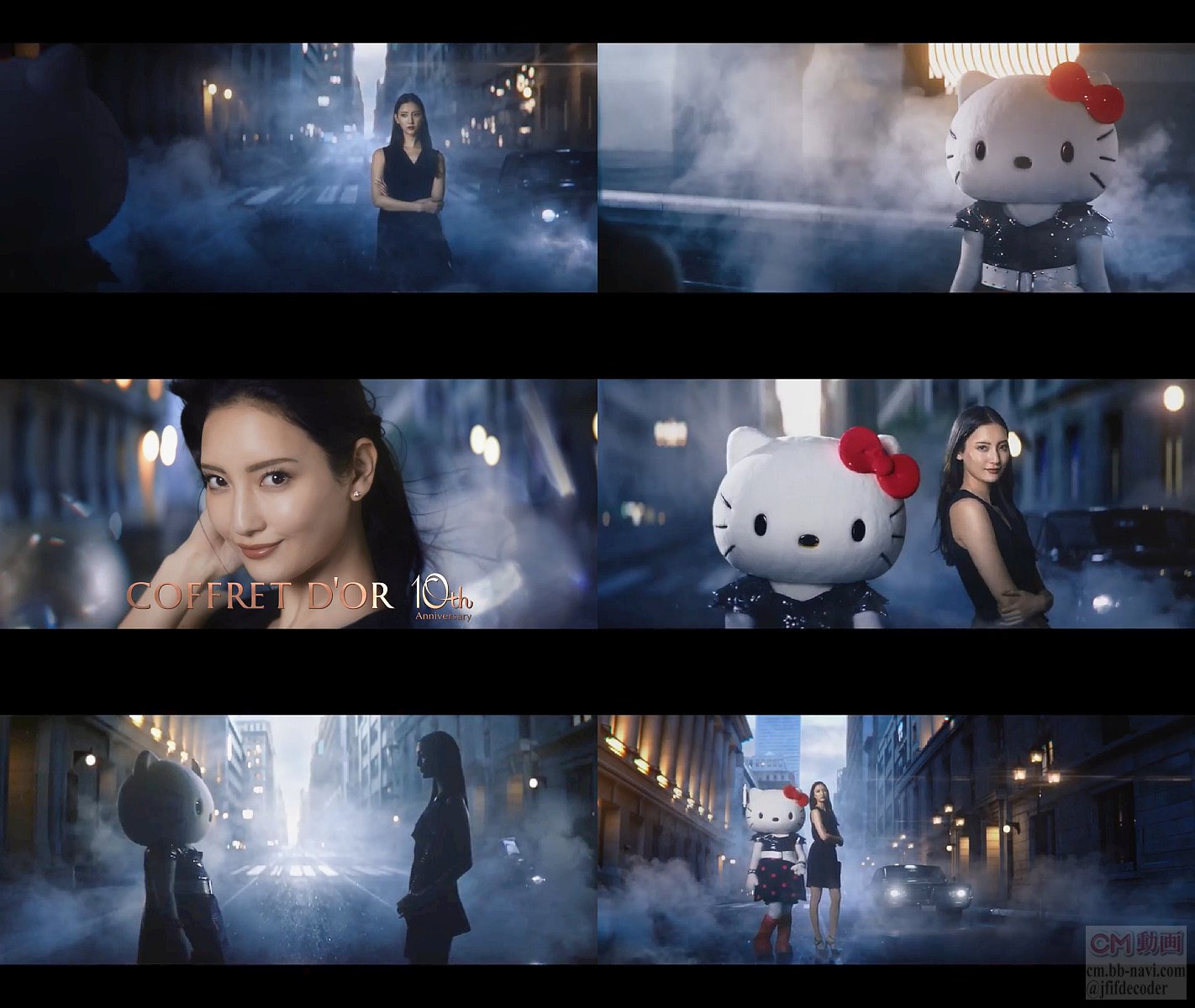 夜明け前の街を歩くミニのシックなワンピース姿の女優の菜々緒さんが、着ぐるみのハローキティと出会う、短い6秒のコフレドールのCM a版です。