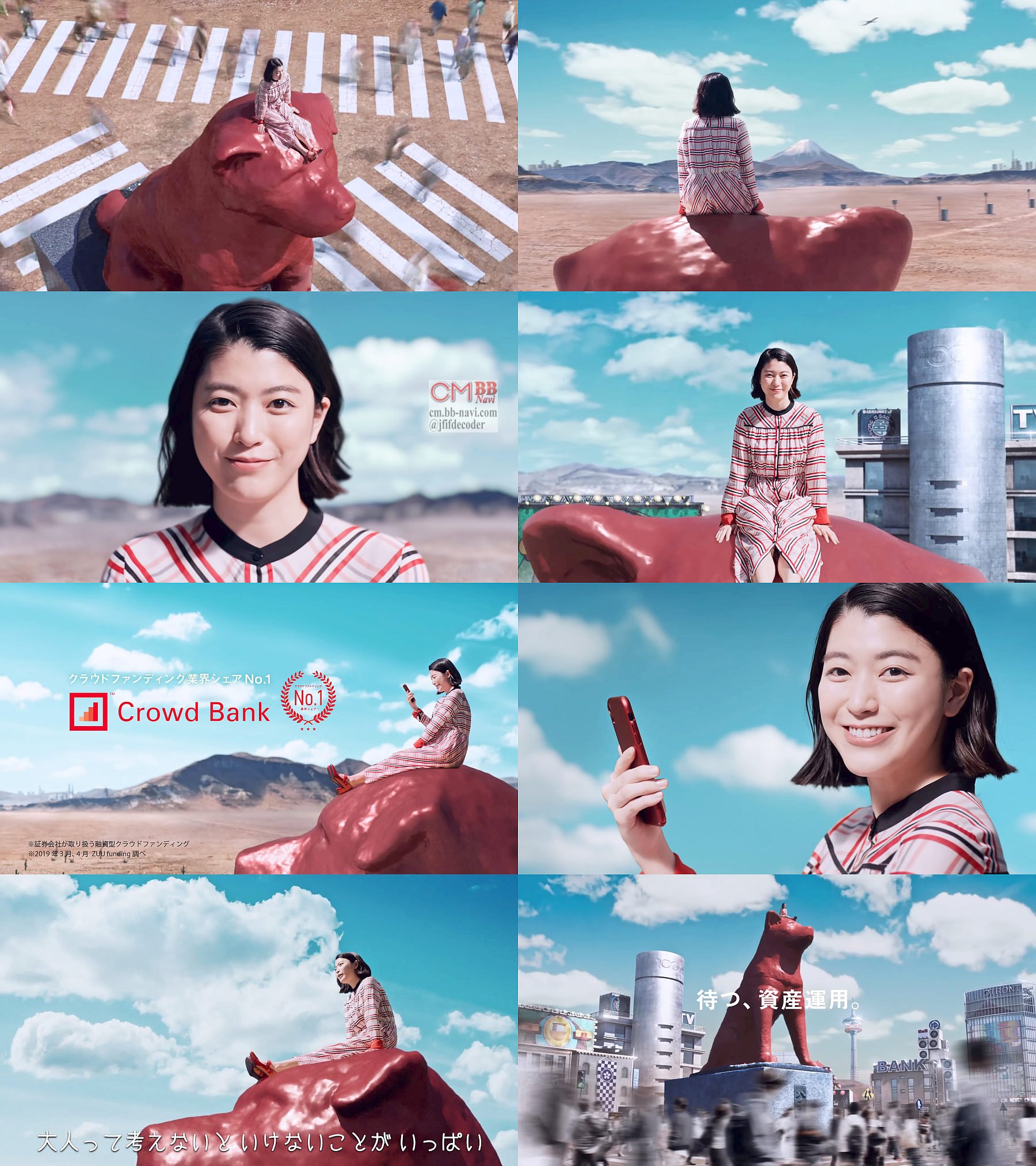 成海璃子さんが、渋谷の交差点で巨大なハチ公の頭の上で「クラウドバンク、それはお金の事で頭を悩ませたくないあなたの為の資産運用」と語るクラウドバンクのCM 30秒版。
