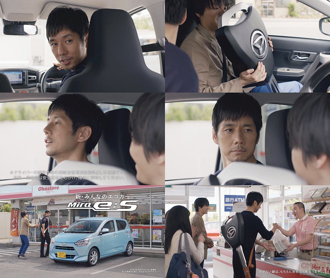 俳優の西島秀俊さんが、鍵のでかいミラ イースを運転し、助手席に乗った岡山天音さんに「いい車っすね」と言われ「鍵、デカいけどな」と返し、誤発信抑制機能を知った岡山天音さんに「凄いっすね。鍵、デカいけど」と言われ、真顔で見つめ返し、コンビニ店員にも(鍵)「でかいっすね」と言われ人気者になっている、ミラ イースのCMです。