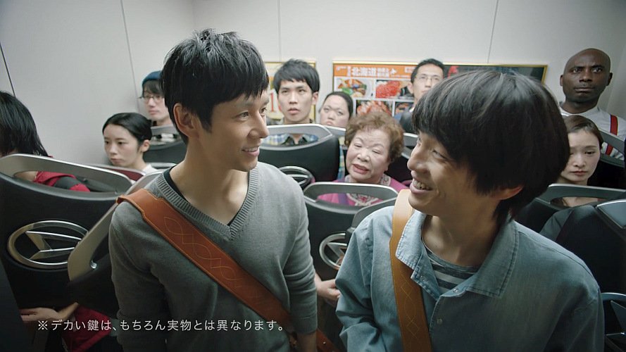 俳優の西島秀俊さんが、「お前も買うとはな」とミラ イースのデカい鍵を肩からぶら下げて歩きながら話しかけ俳優の岡山天音さんも肩に大きなミライースのデカい鍵をぶら下げていて、エレベーターに乗り込むと、全員大きなデカい鍵を持っていて、次々とミライースの安全装備を話し出して、あっけにとられてしまう。ミライース デカい鍵シリーズCM第4弾のCMです。