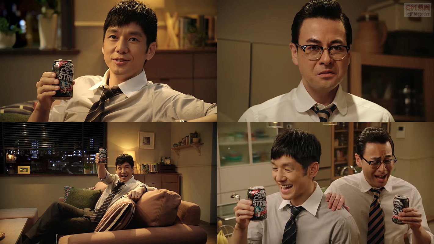 ネクタイにワイシャツ姿のサラリーマン役の西島秀俊さんが、冷蔵庫からキリン・ザ・ストロングを出してリビングのソファでくつろぎ「仕事の後はキリン・ザ・ストロング」とうまそうに飲み、鈴木浩介さんに「お前もどうだ」と言い、鈴木浩介さんが「西島、人んちの勝手に飲むな」と怒り即座に「すまん」と謝るCMです。