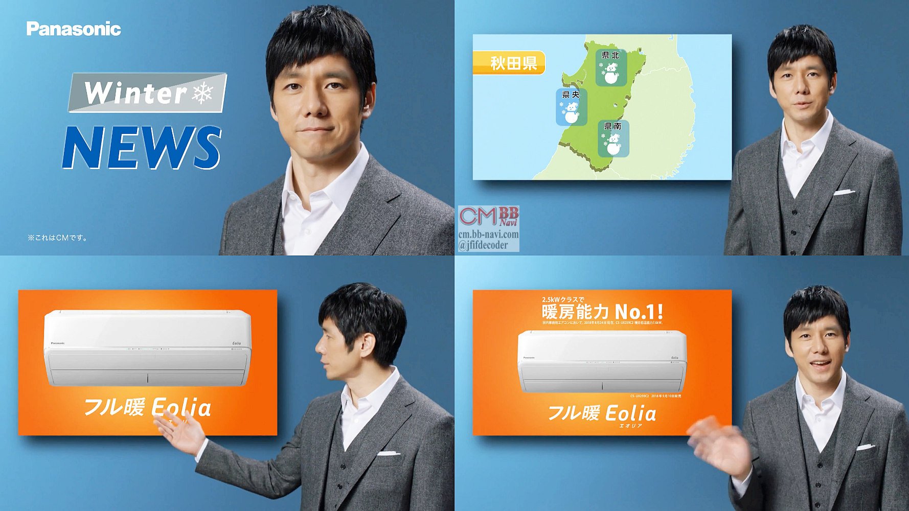 ジャケット姿の俳優の西島秀俊さんが、ニュースキャスターやのように登場し「今年も寒い冬がやってきます」「フル暖エオリアの暖房力が期待できますね」と語り、秋田県の女性タレント 相場詩織さんがフル暖エオリアの活躍を秋田弁を交えて紹介し、最後に西島秀俊さんが「秋田県の皆さん、暖房力ナンバーワンのフル暖エオリアで、ぜひ温まってけれ〜」と秋田弁で微笑むCM 30秒版改訂版(機種モデルがUX259C2 2019年9月10日発売に変わりました)です。