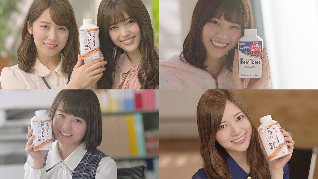 乃木坂46のメンバー(白石麻衣,松村沙友理,伊藤万理華,衛藤美彩,西野七瀬)が、しまるボトルシリーズの明治白のひととき珈琲と明治The MilkTeaを手にしながら、「お疲れさま」「白のひとときで、ゆったり、しよ」「The MilkTea ゆったり 飲も」と言う、明治のCMです。