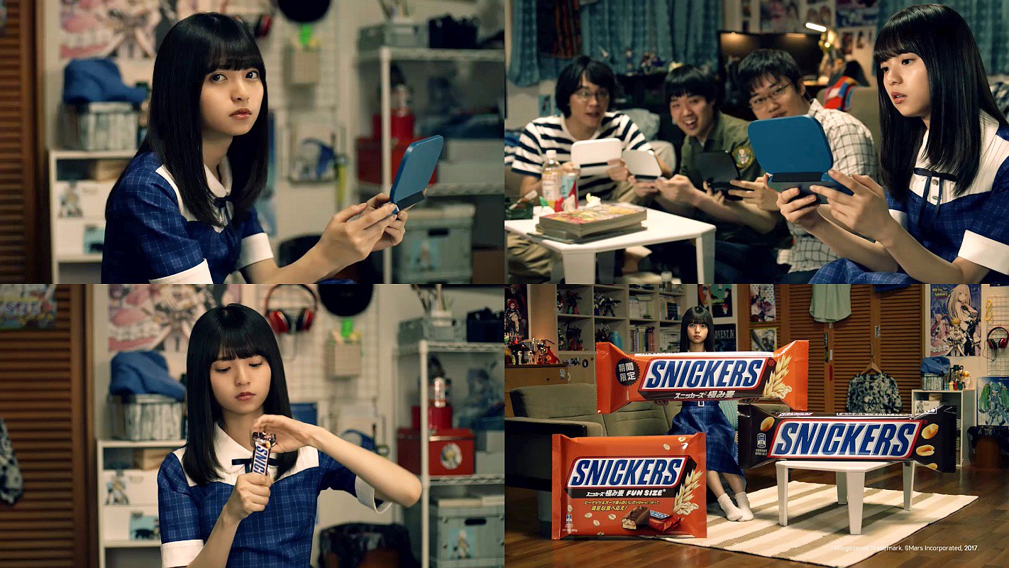 「彼女よりゲームだよなぁ」と言う野郎達に、乃木坂46の齋藤飛鳥さんが「お前ら、彼女いた事ねぇだろ」「どーせ、お前らまだ…」と、ちょっと毒舌を吐き、スニッカーズを食べると機嫌を良くして元のロン毛の男子に戻る、マースジャパン スニッカーズのCMです。