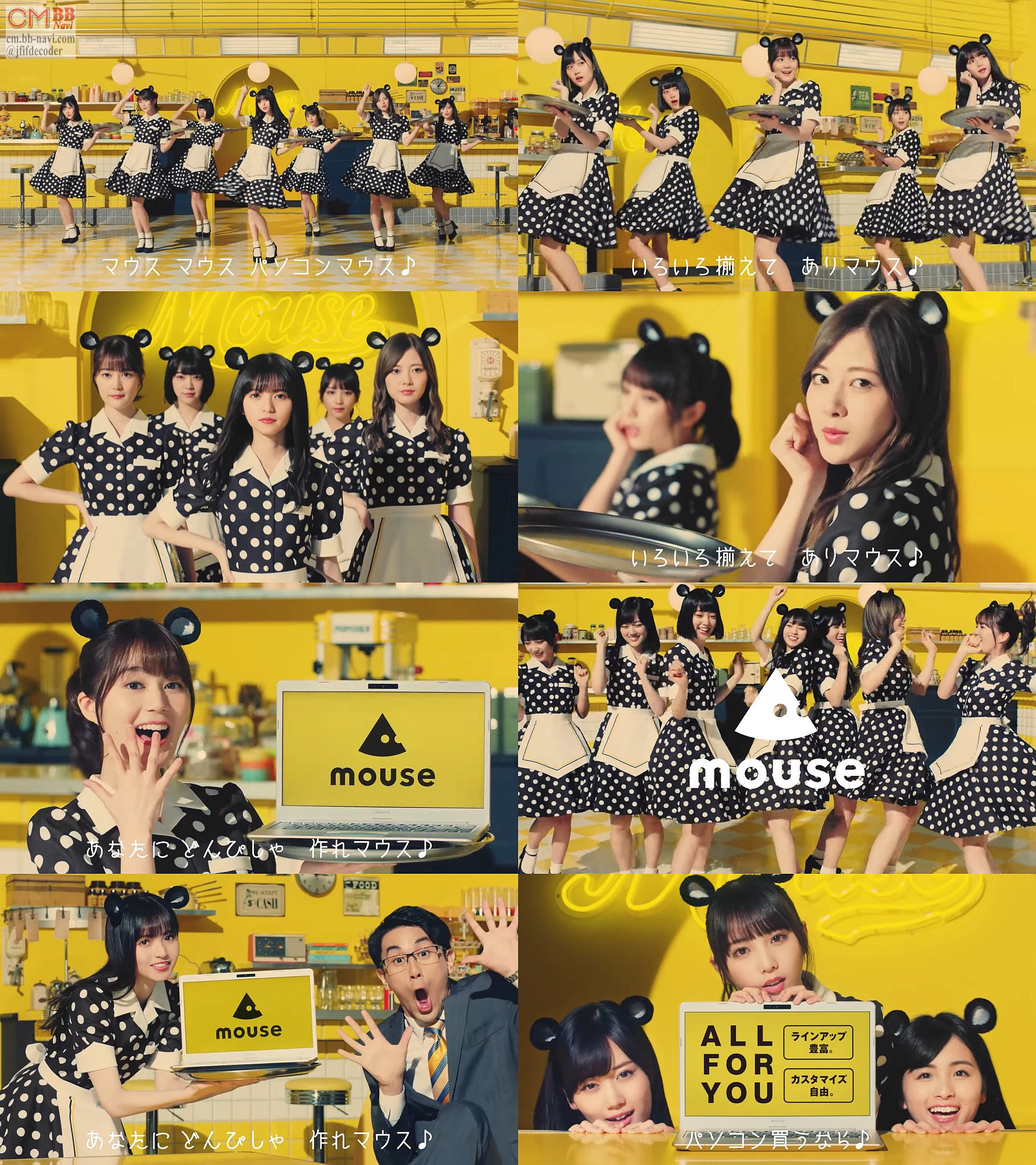 ネズミの耳をつけて水玉のワンピースを着たウェイトレス姿の乃木坂46のメンバーが「マウスマウス、パソコンマウス♪ いろいろ揃えてありマウス♪ あなたにドンピシャきちんと作れマウス♪ マウスマウス、パソコン買うなら〜♪」と歌って踊って、最後は「どれにしまチュ?」と言う、マウスコンピュータのCMです。