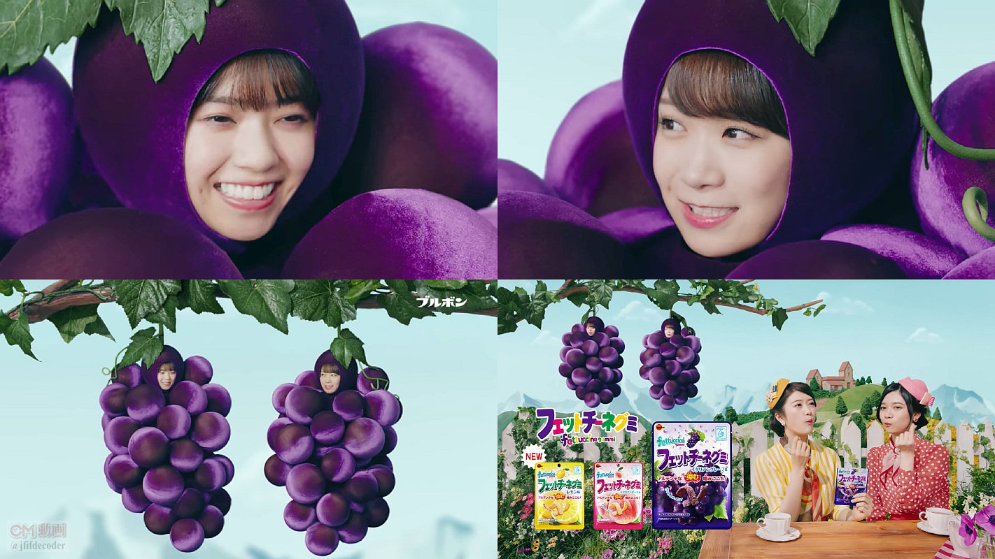 乃木坂46の西野七瀬さんと秋元真夏さんがぶどうになって、「なーちゃんの夢は?」と聞くと西野七瀬さんの夢はフェットチーネグミになる事だけど「無理だよ。私、ごく普通のぶどうだし」と照れながら言ってると、フェットチーネグミは使ってるぶどうがちょっと違うと言ってるのを聞いて拗ねてしまう、ブルボン フェットチーネグミのCM レモン味の”NEW”が消えた改訂版です。