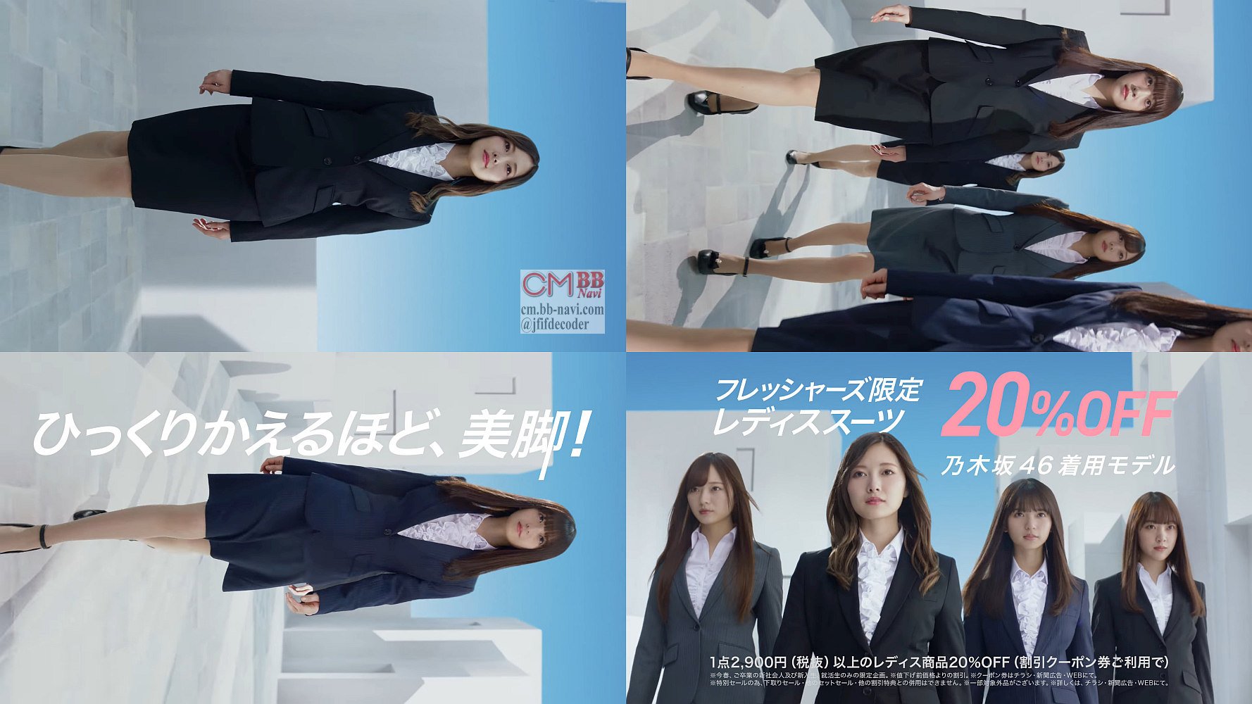 画面が横倒しのままで、乃木坂46の白石麻衣,齋藤飛鳥,堀未央奈,梅澤美波の4人が長い脚を披露したリクルートスーツ姿で「横から失礼します」と登場し、「入学式のスーツどうしよう? なんてお考えの皆さん、この際、ひっくりかえるほどの美脚になってみませんか?」と問いかけ、画面が横倒しから正常になります。