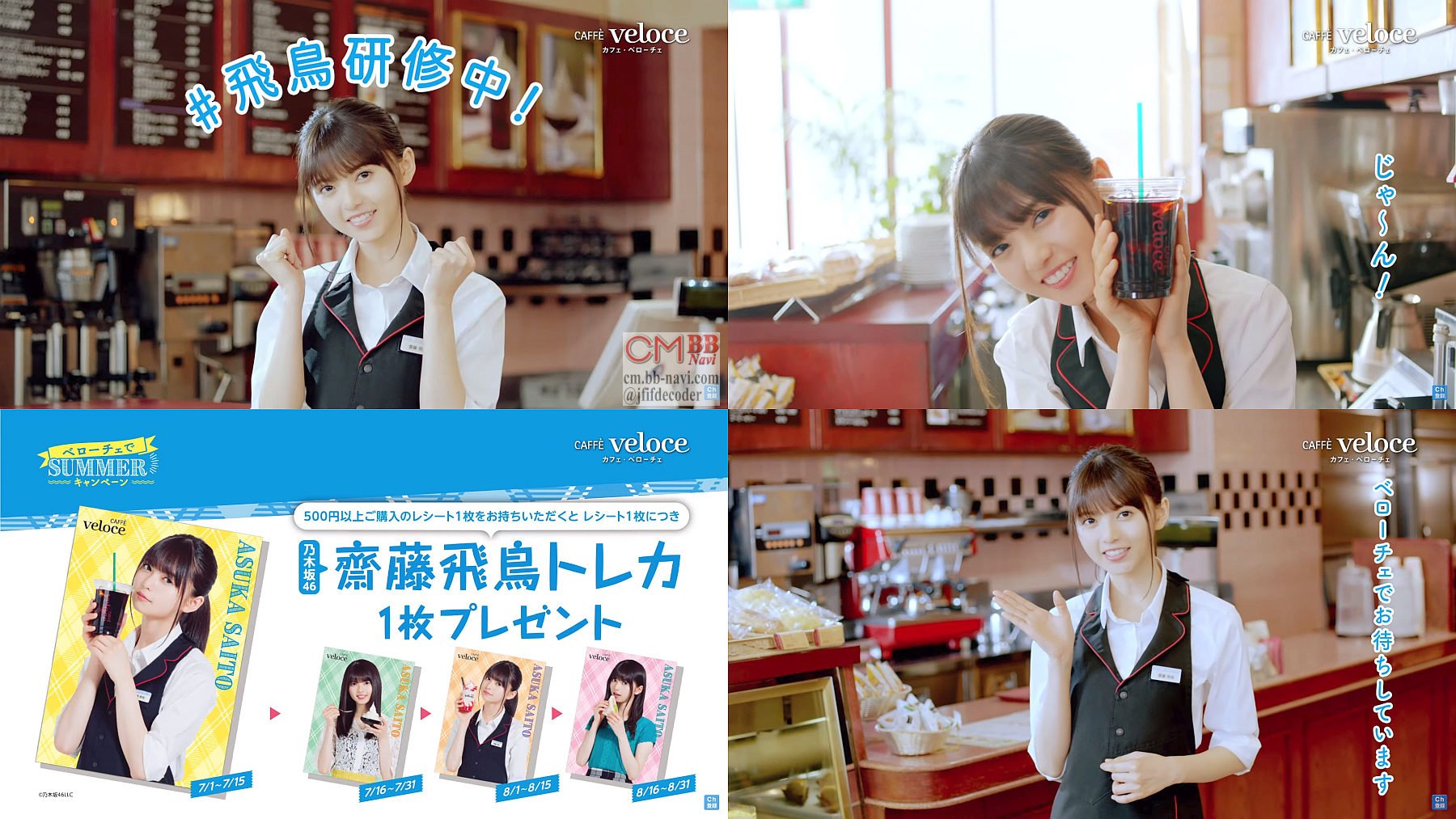 乃木坂46の齋藤飛鳥さんがカフェ・ベローチェの店員役で「飛鳥研修中」と登場し、「イイ夏の日はサイズアップ無料」「齋藤飛鳥テレカ貰える」とキャペーンを告知する、シャノアール カフェ・ベローチェのCMです。