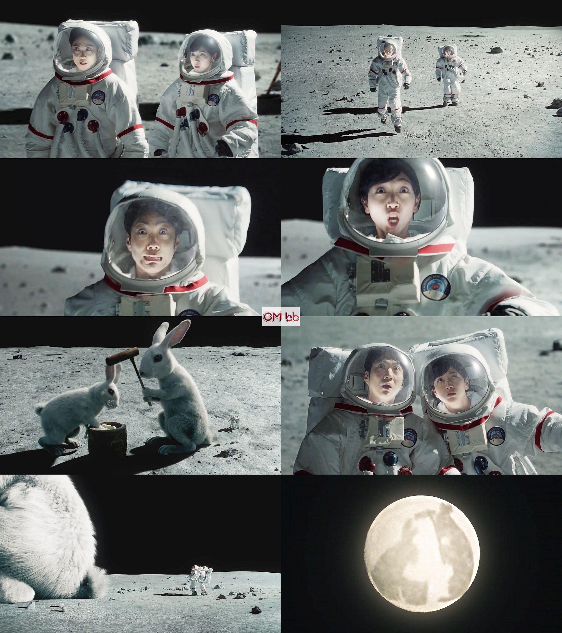 宇宙服に身を包んだ、狂言師の野村萬斎さんと女優の安藤サクラさんが「トンタントンタン ヒノノニトン」と月面を調査し、「危険を察知」「衝突を防ぎました」と見ると、そこには巨大なうさぎが…